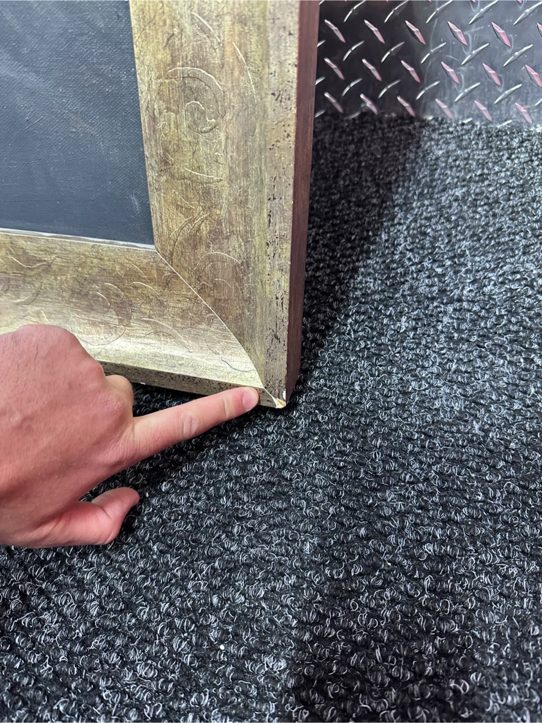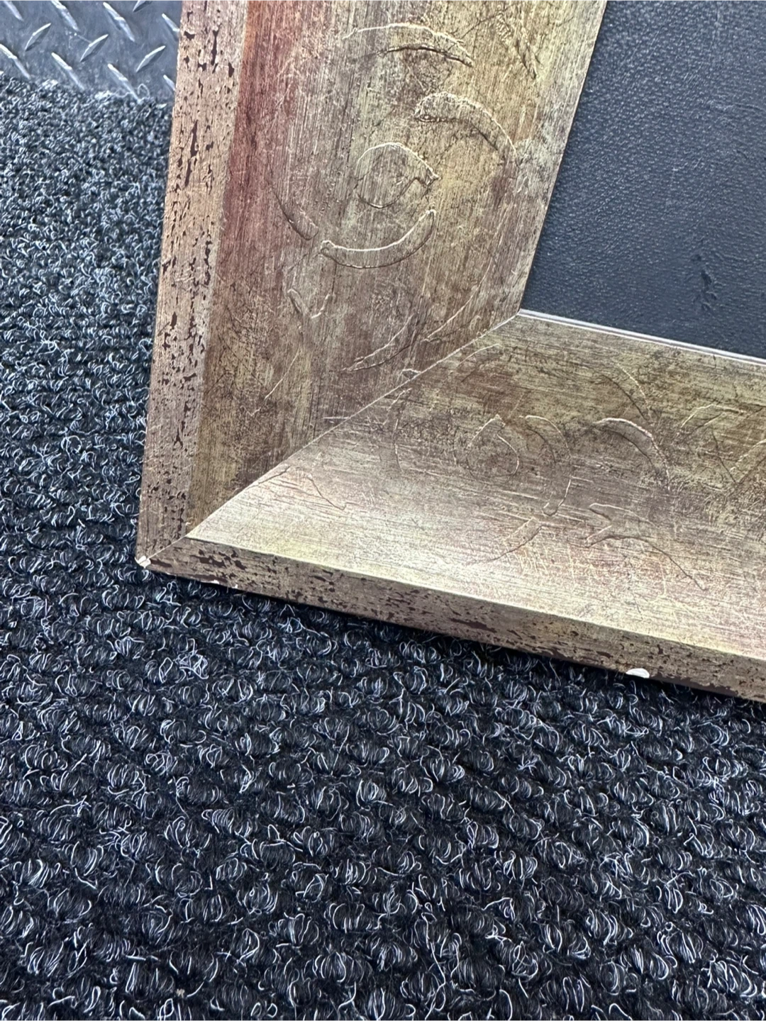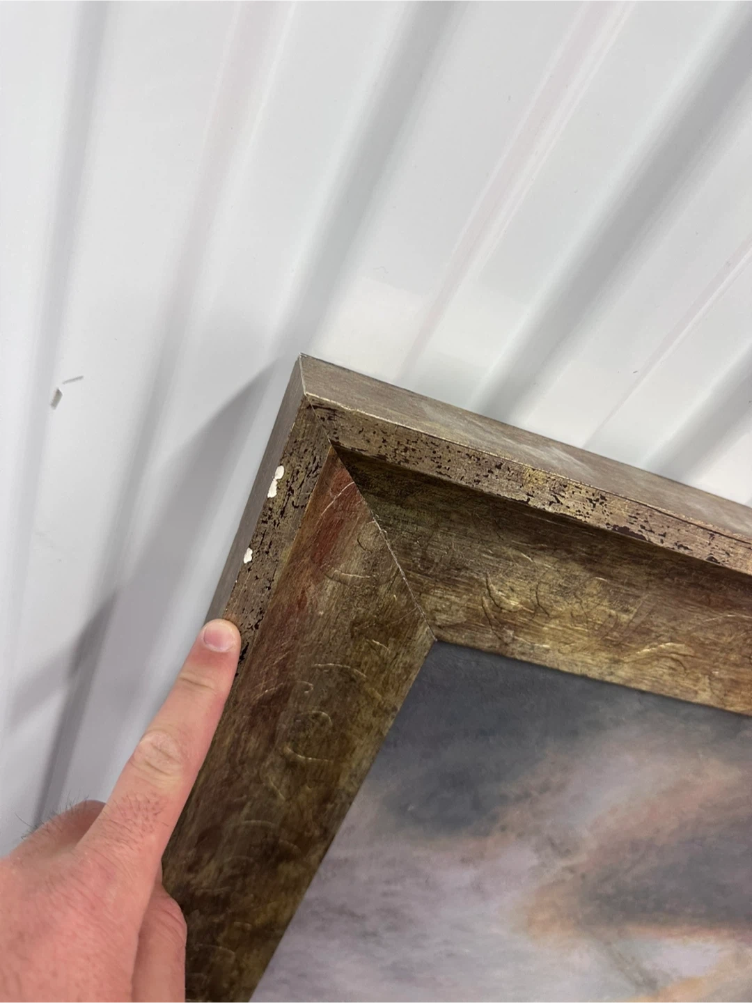 This framed art print depicts "The Storm on the Sea of Galilee." The frame is distressed gold with ornate detailing. There are some chips and wear on the frame's corners.