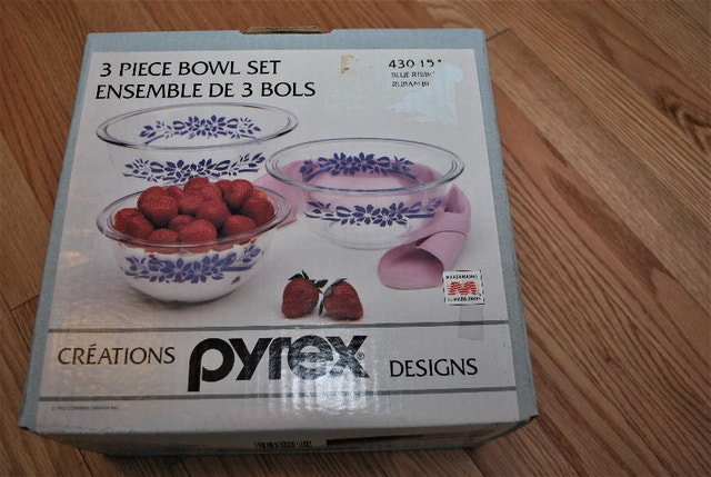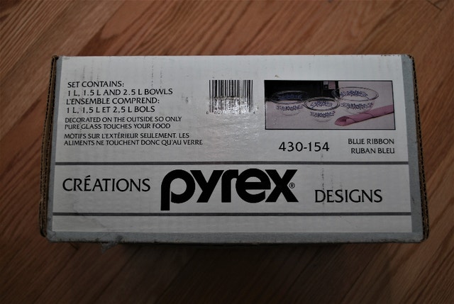 Pyrex 3 piece bowl set Blue Ribbon pattern #430-154. NEW still in box never opened. 1L, 1.5L & 2.5L bowls. PU: Burnhamthorpe Rd West /Erin Mills Parkway in Mississauga.