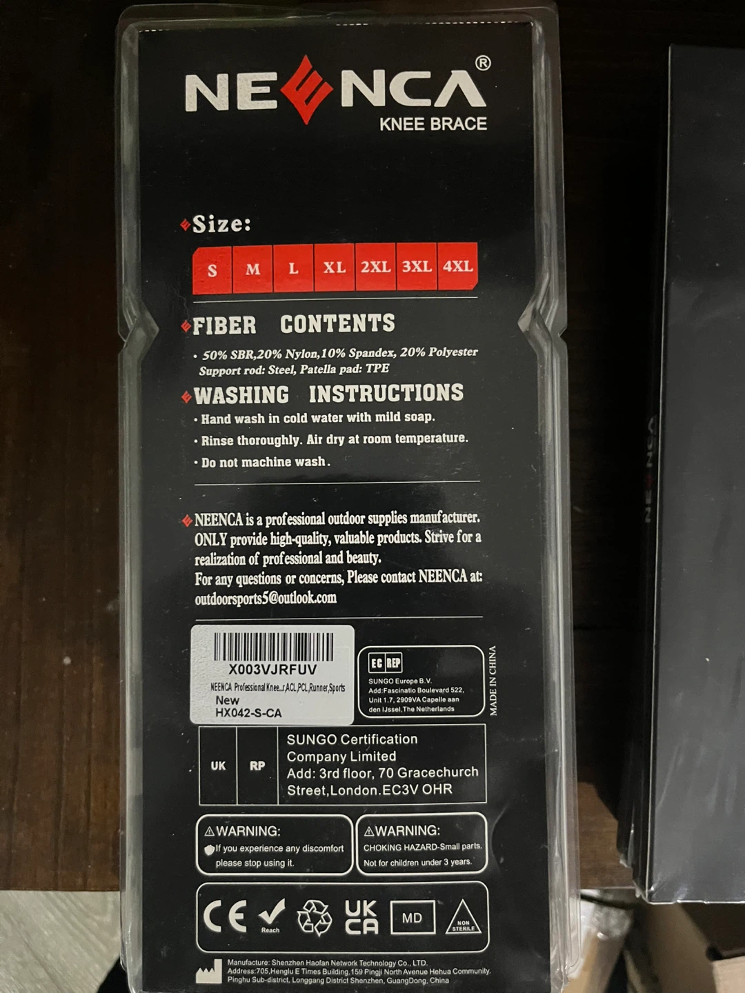 Selling a brand new NEENCA knee brace! It's never been used and comes in its original packaging. This is a size XL. It's part of the Sports Protection Series and designed to support activities like basketball, running, tennis, climbing, and biking. It features a design patent and provides professional support. The fiber content is 50% SBR, 20% Nylon, 10% Spandex, and 20% Polyester. The support rod is made of steel, and the patella pad is TPE. Hand washing instructions are included on the packaging