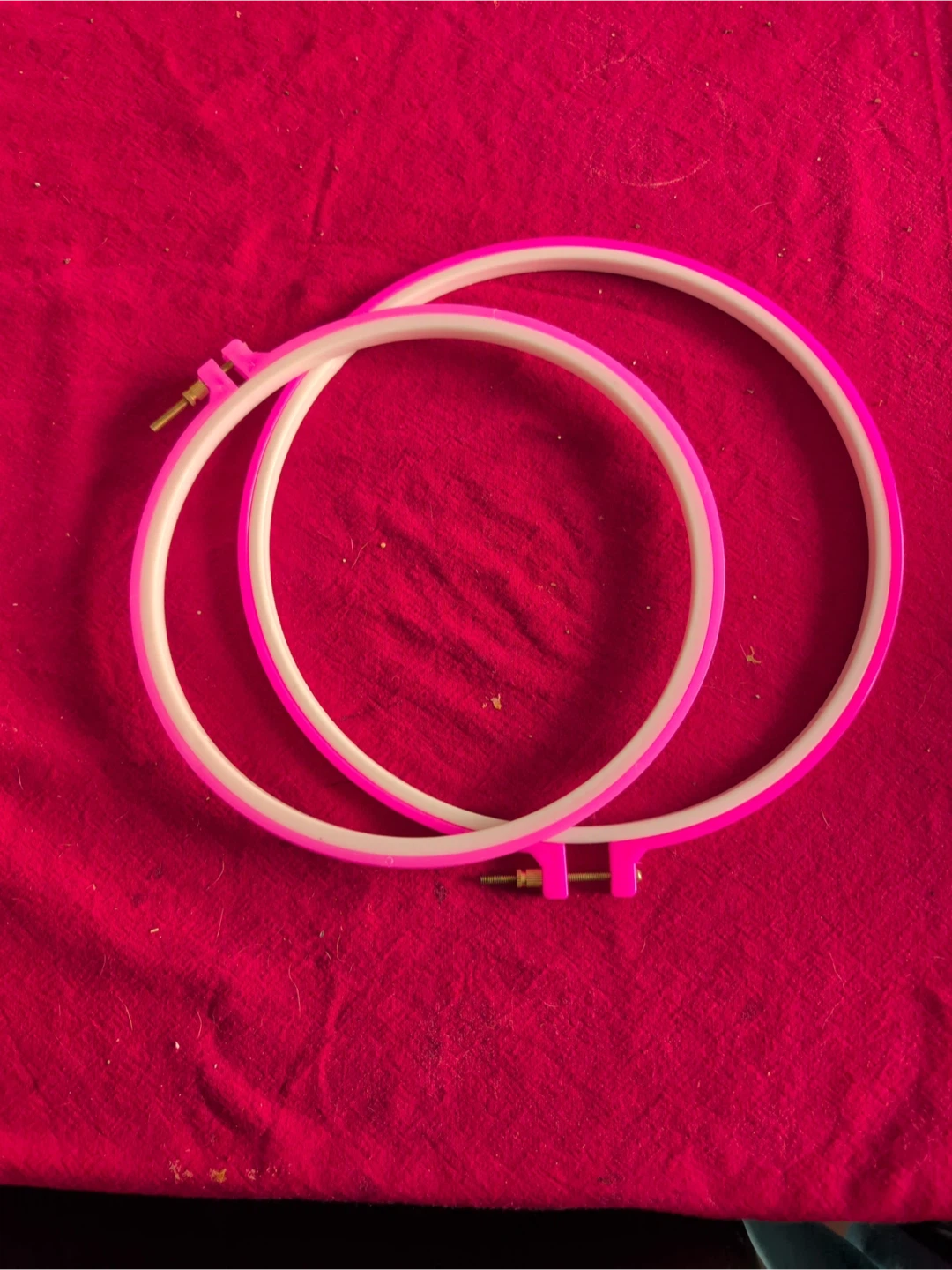 Two embroidery hoops, perfect for your next crafting project! They are pink and white and in great condition. Get creative and start stitching, pick up only.