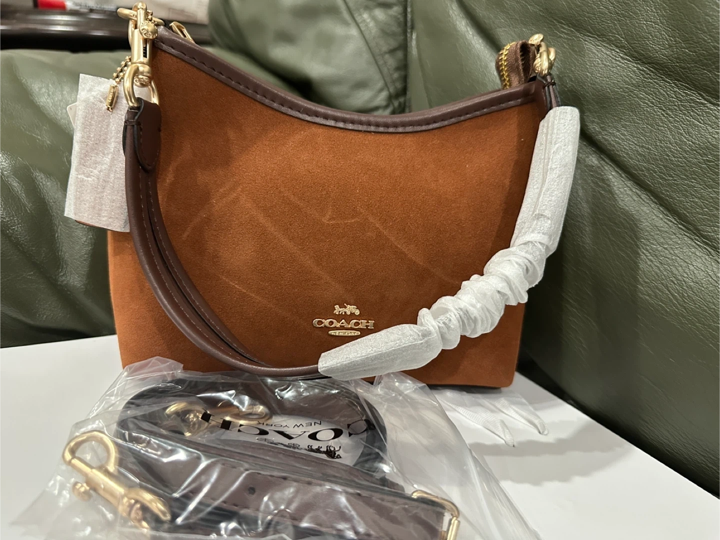 This is a Coach shoulder bag made with suede material. It comes with an adjustable strap and a wrist strap for versatile carrying options. It's a stylish accessory for everyday use!