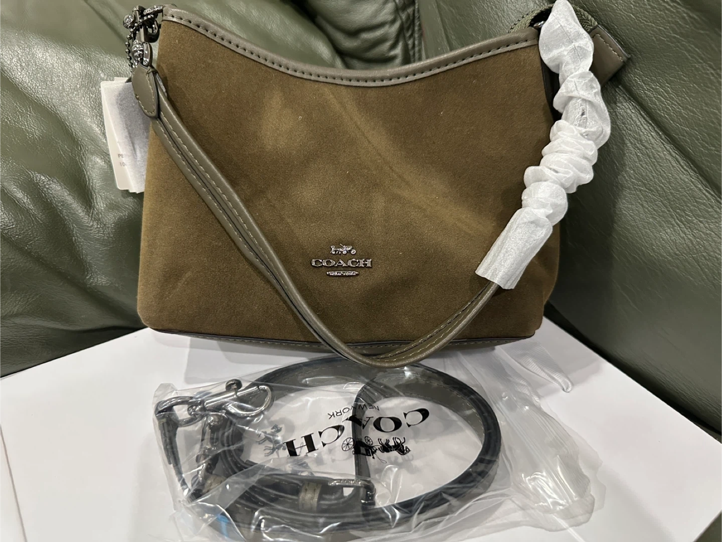 This is a Coach shoulder bag made with suede material. It comes with an adjustable strap and a wrist strap for versatile carrying options. It's a stylish accessory for everyday use!