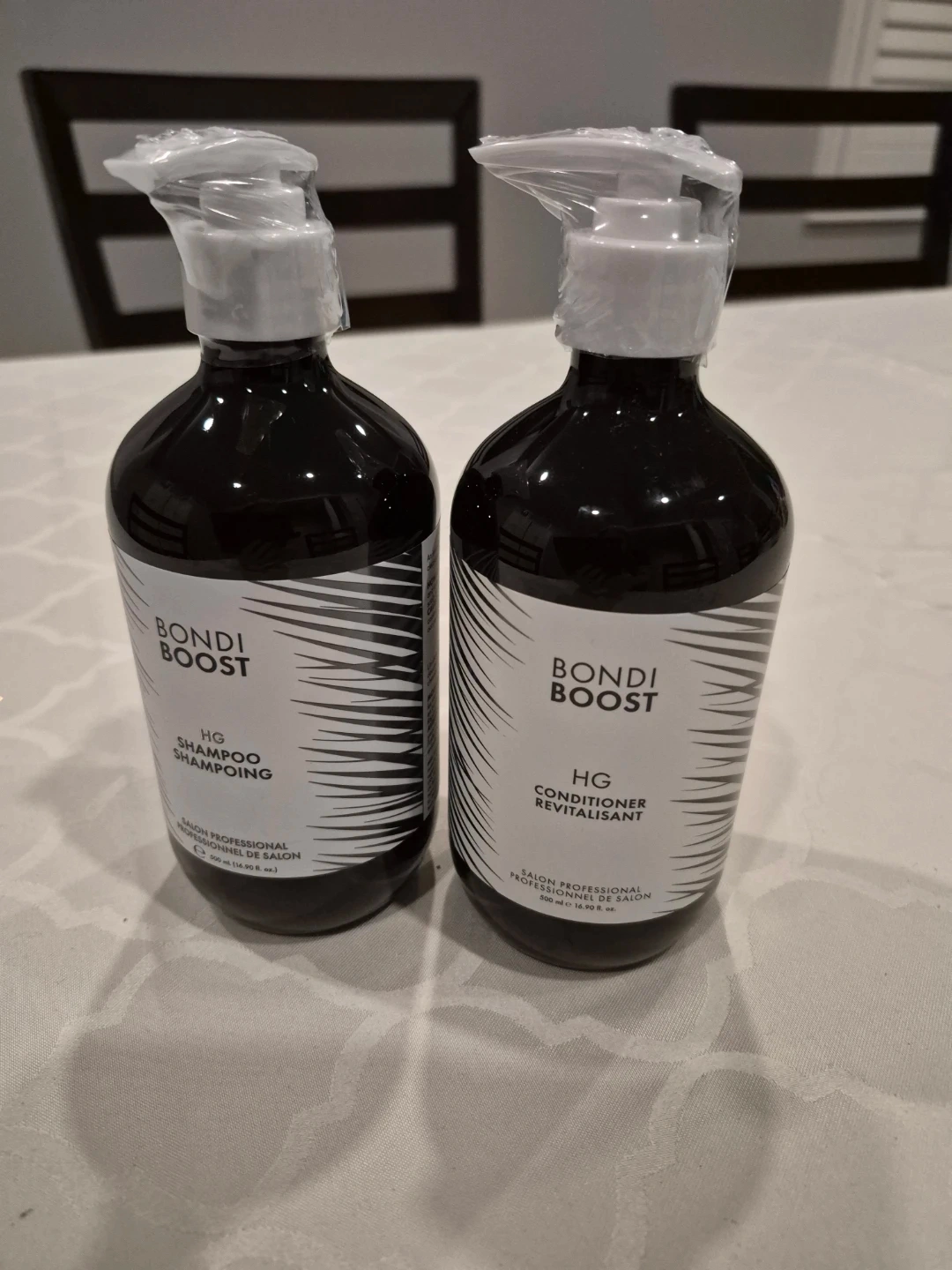 This set includes BondiBoost HG Shampoo and HG Conditioner for thinning hair. Both bottles contain rosemary and are salon professional formulas. Each bottle is 500ml