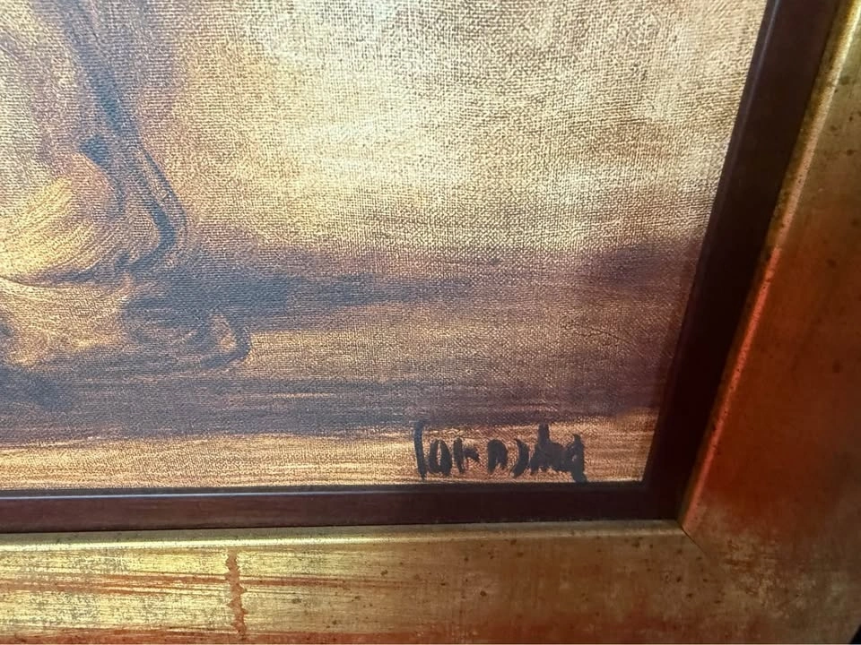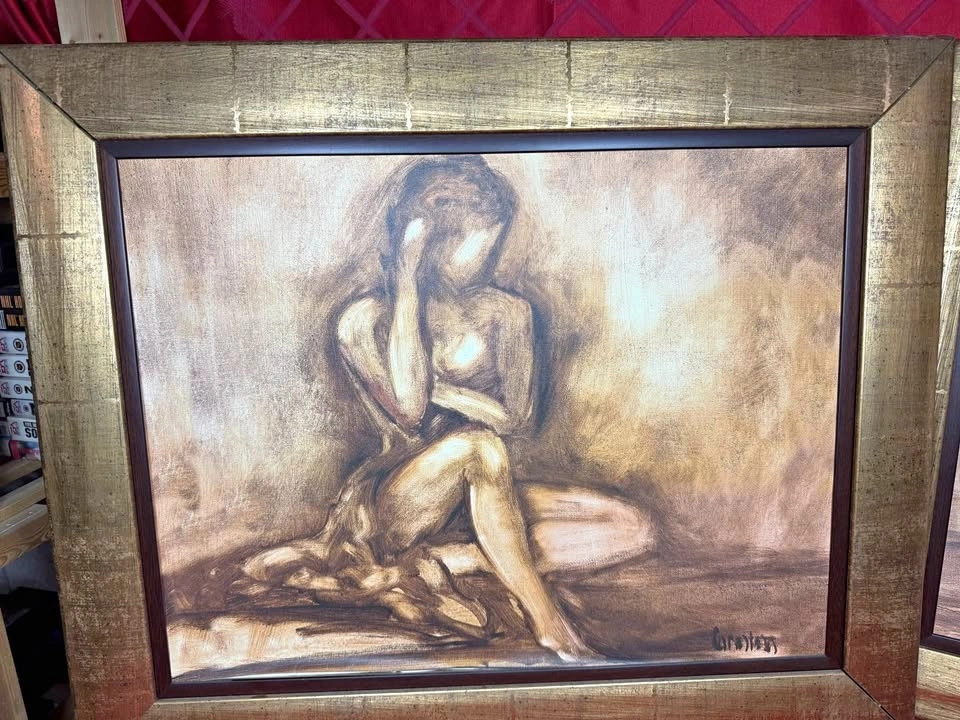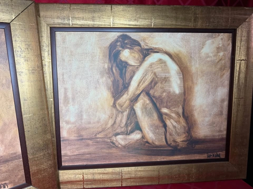 Unique two framed art pieces from Bombay Company. Each features an abstract figure in sepia tones with gold-coloured frames that have a distressed finish. Dimensions are 27” x 32”. Pick up in Brooklin (Thickson & Columbus area).