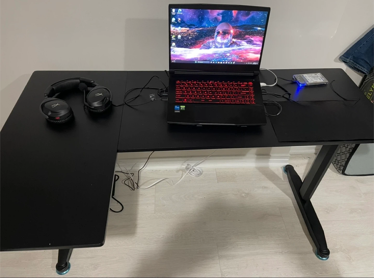 Selling a black L-shaped gaming desk. It's in good condition and perfect for a home office or gaming setup. The desk offers plenty of space for your computer, accessories, and more!