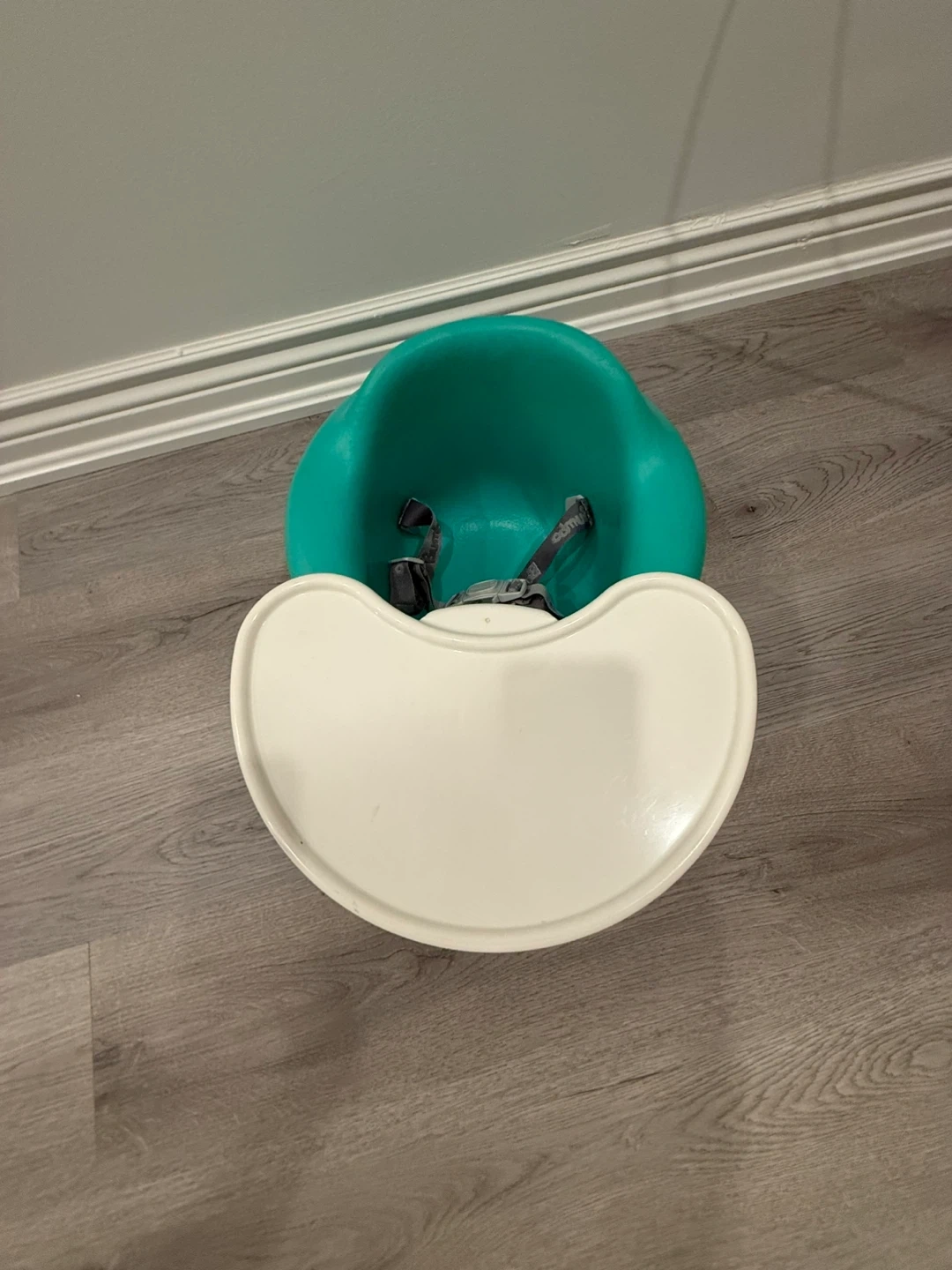 Comfy Bumbo floor seat. Is green with white tray. Has safety harness. Great for little ones learning to sit up. It comes with a detachable tray for snacks and toys. Easy to clean. Lightly used, pet-free and smoke-free home.