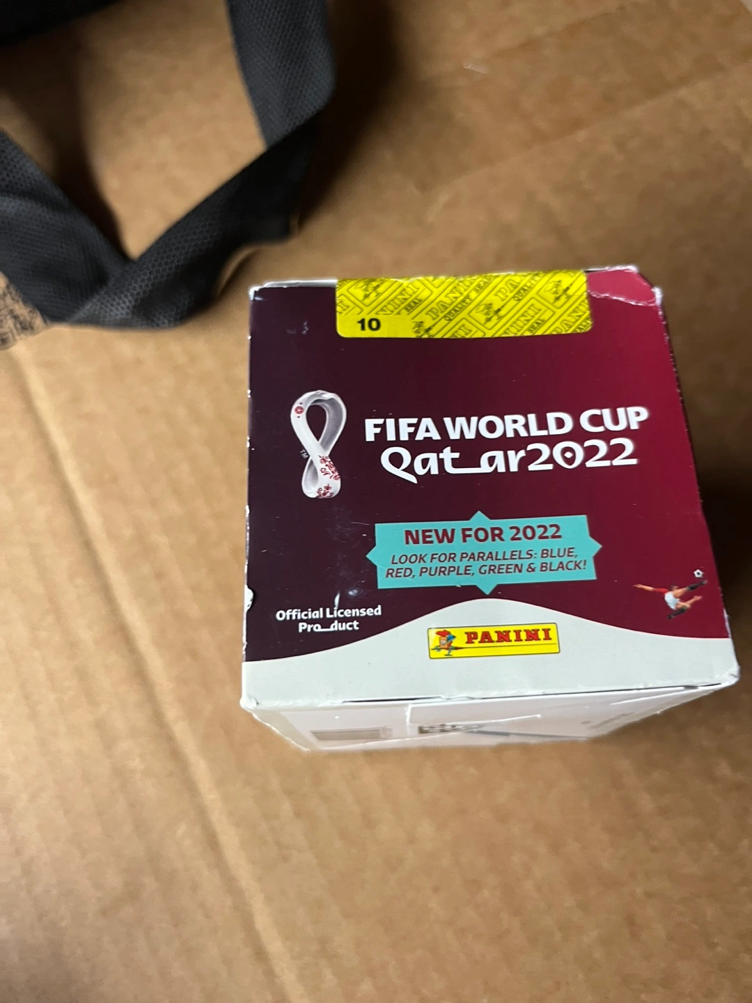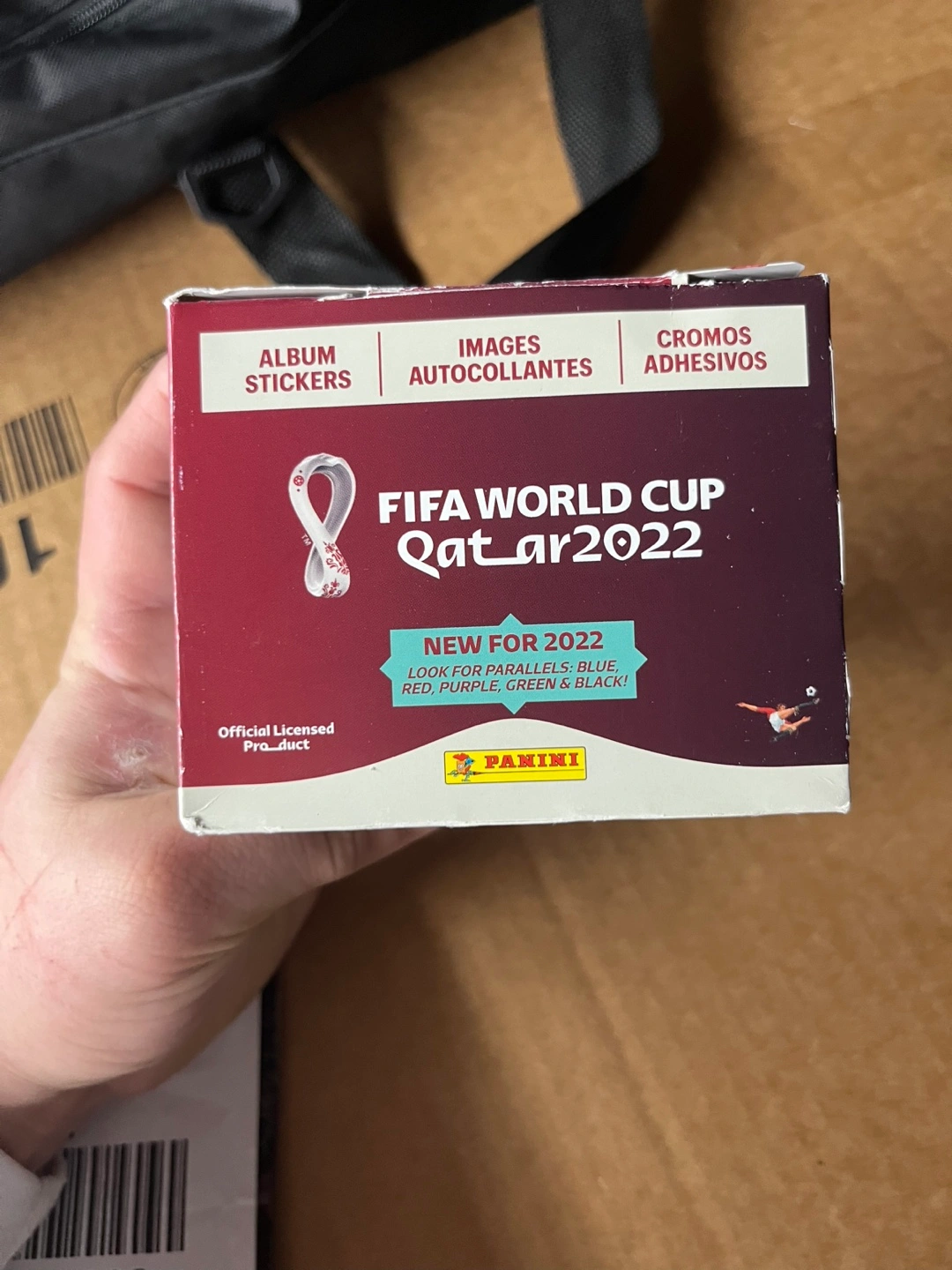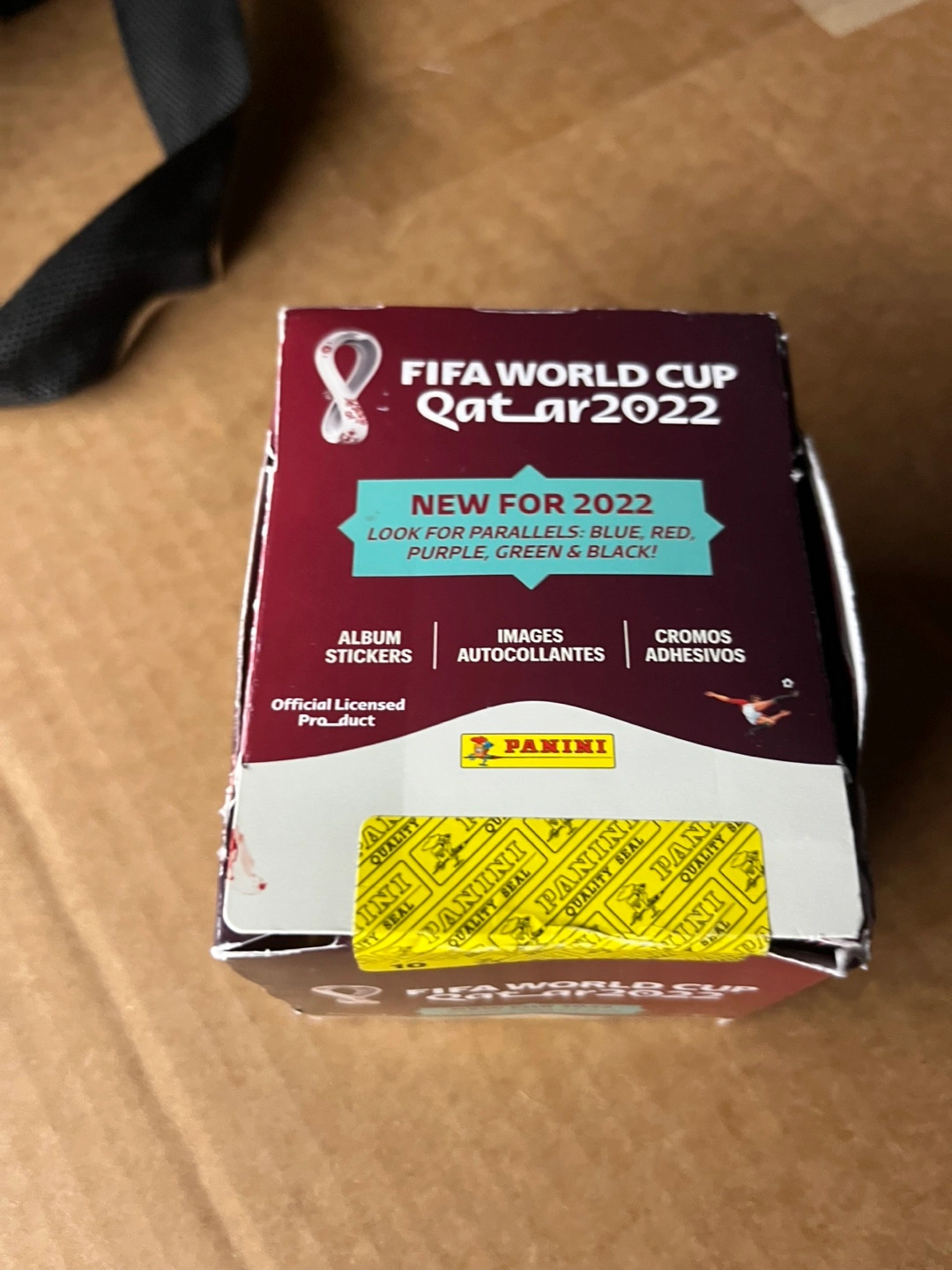 Sealed box of Panini FIFA World Cup Qatar 2022 stickers. Album stickers, images, and cromos. New for 2022. Look for parallels. Official licensed product.