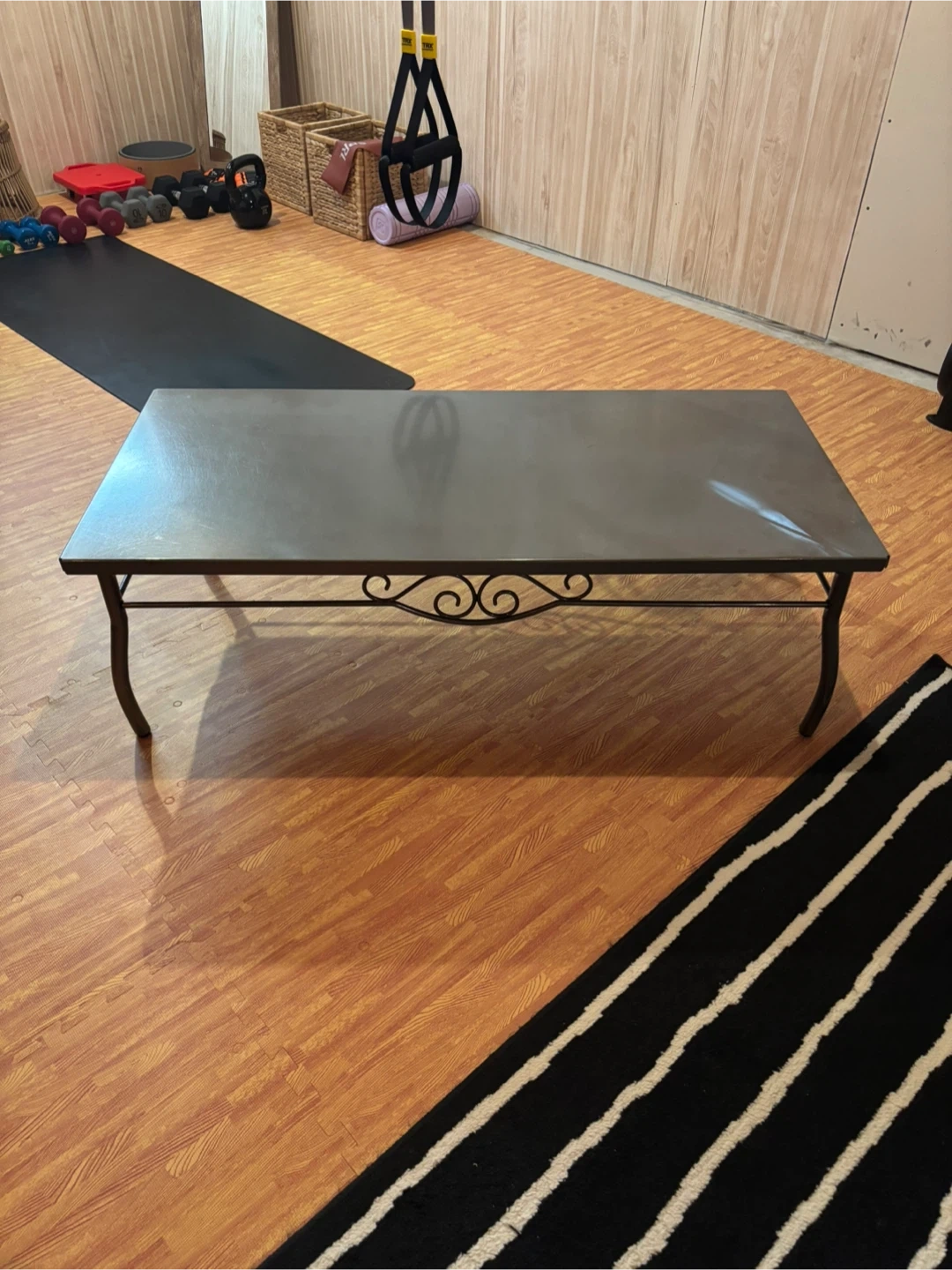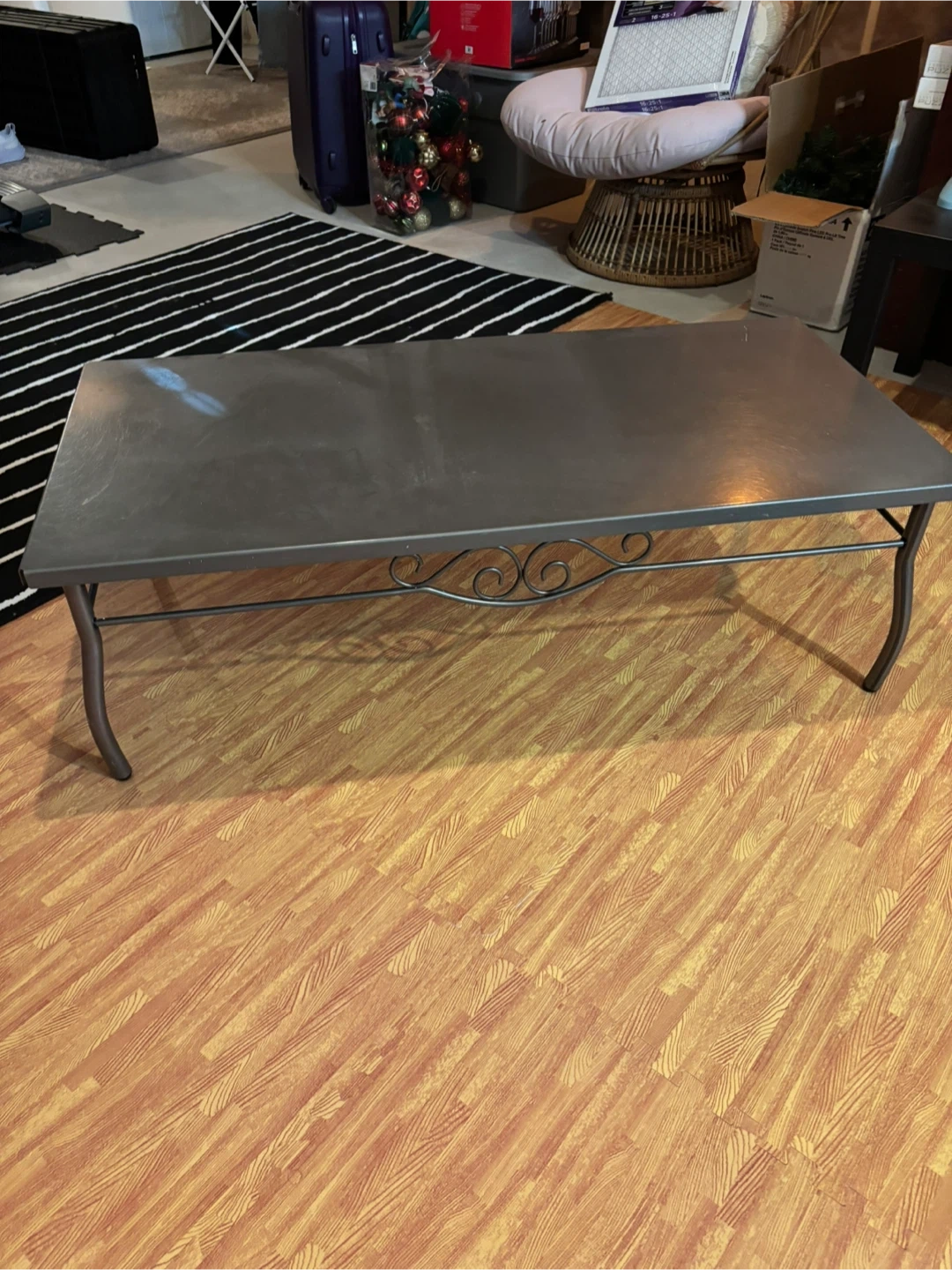 This is a rectangular coffee table made of dark silver metal. It has four curved legs with decorative scrollwork along the stretchers. The metal frame offers durability. Its simple design makes it a versatile addition to a living space. Couple scratches on it but otherwise good condition!