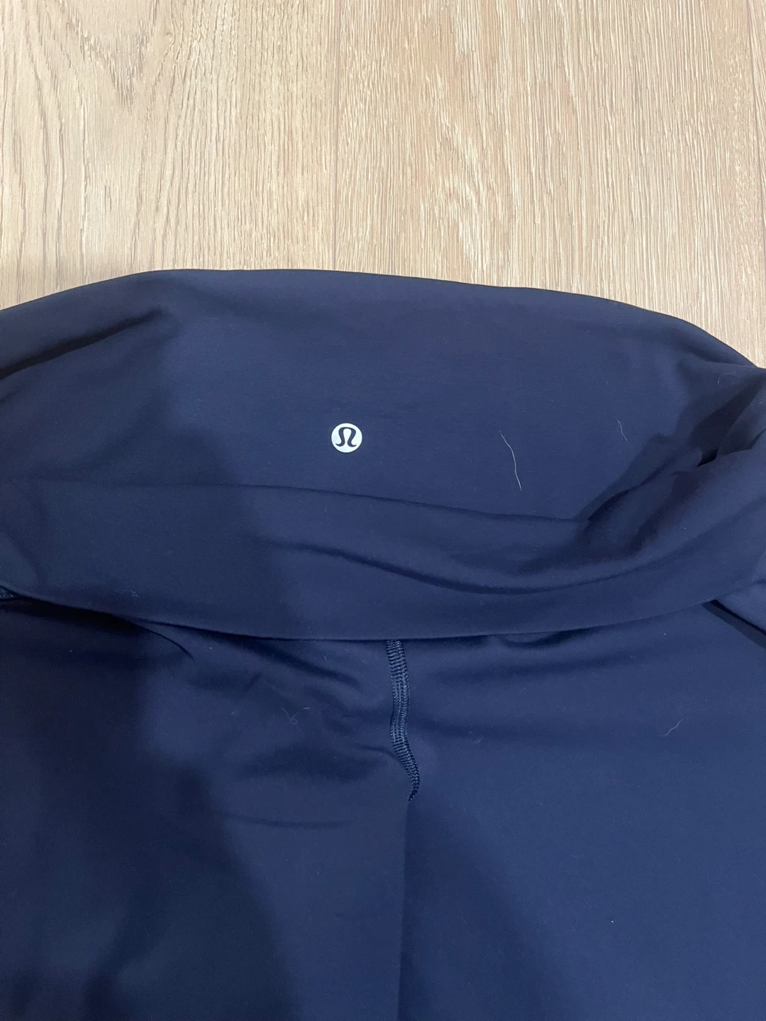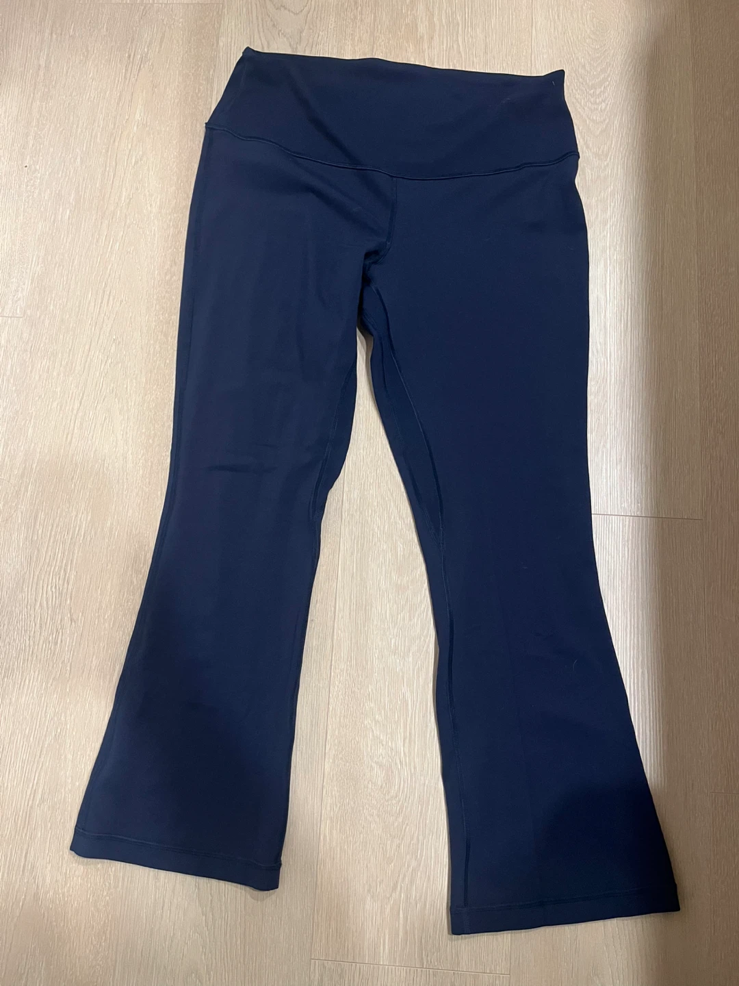 Navy blue flare leggings from Lululemon. These pants feature a comfortable stretch fabric and a flattering flare leg design. They're perfect for yoga, workouts, or casual wear.
