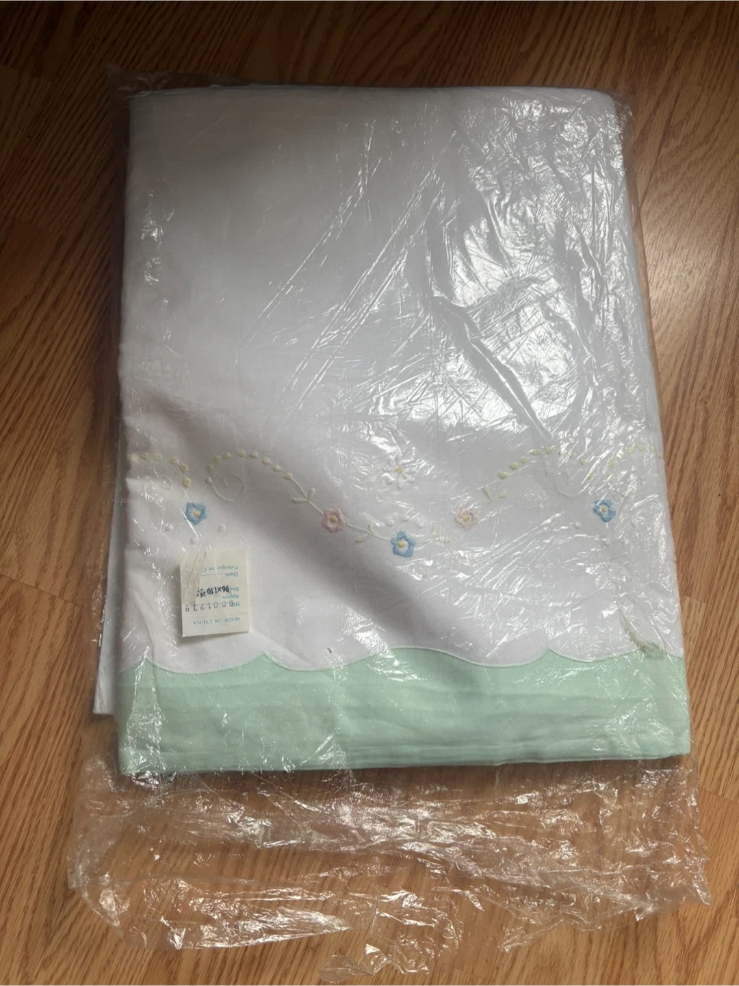 This is a new white sheet set with delicate floral embroidery. It features a light green scalloped trim. The set is made of a soft fabric.