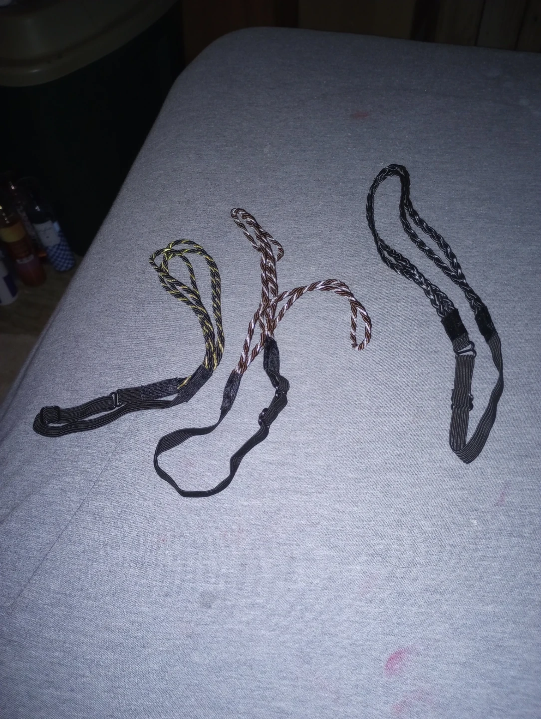 Selling a set of three braided neck straps. Two have mixed colors with black, one is black and gray. Each strap features an adjustable buckle for a secure fit. These are great for holding small electronics or keys.