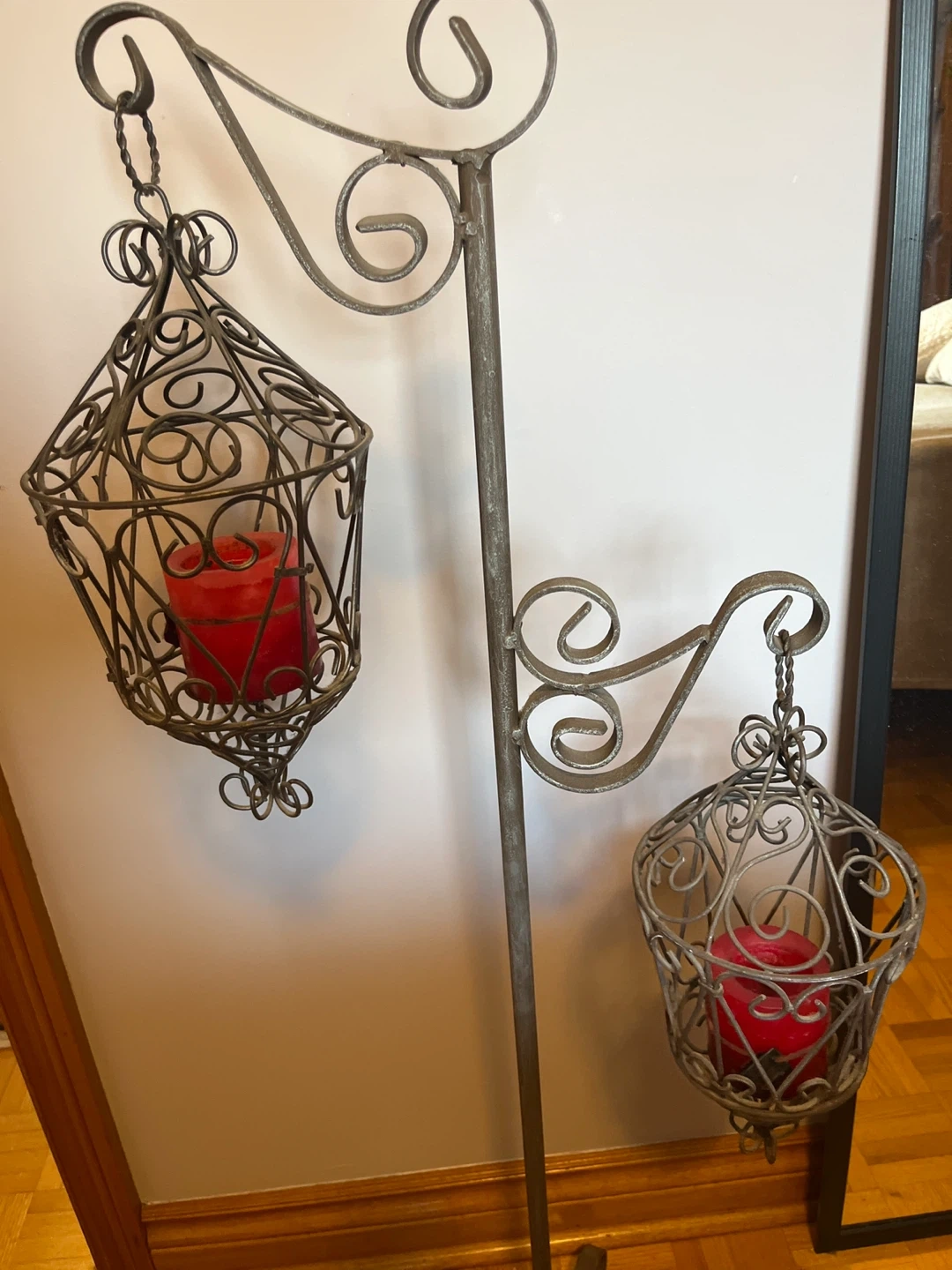 Ornate vintage metal floor candelabra. Features two decorative hanging lanterns, each holding a red pillar candle. Creates a warm ambiance. CASH only please.