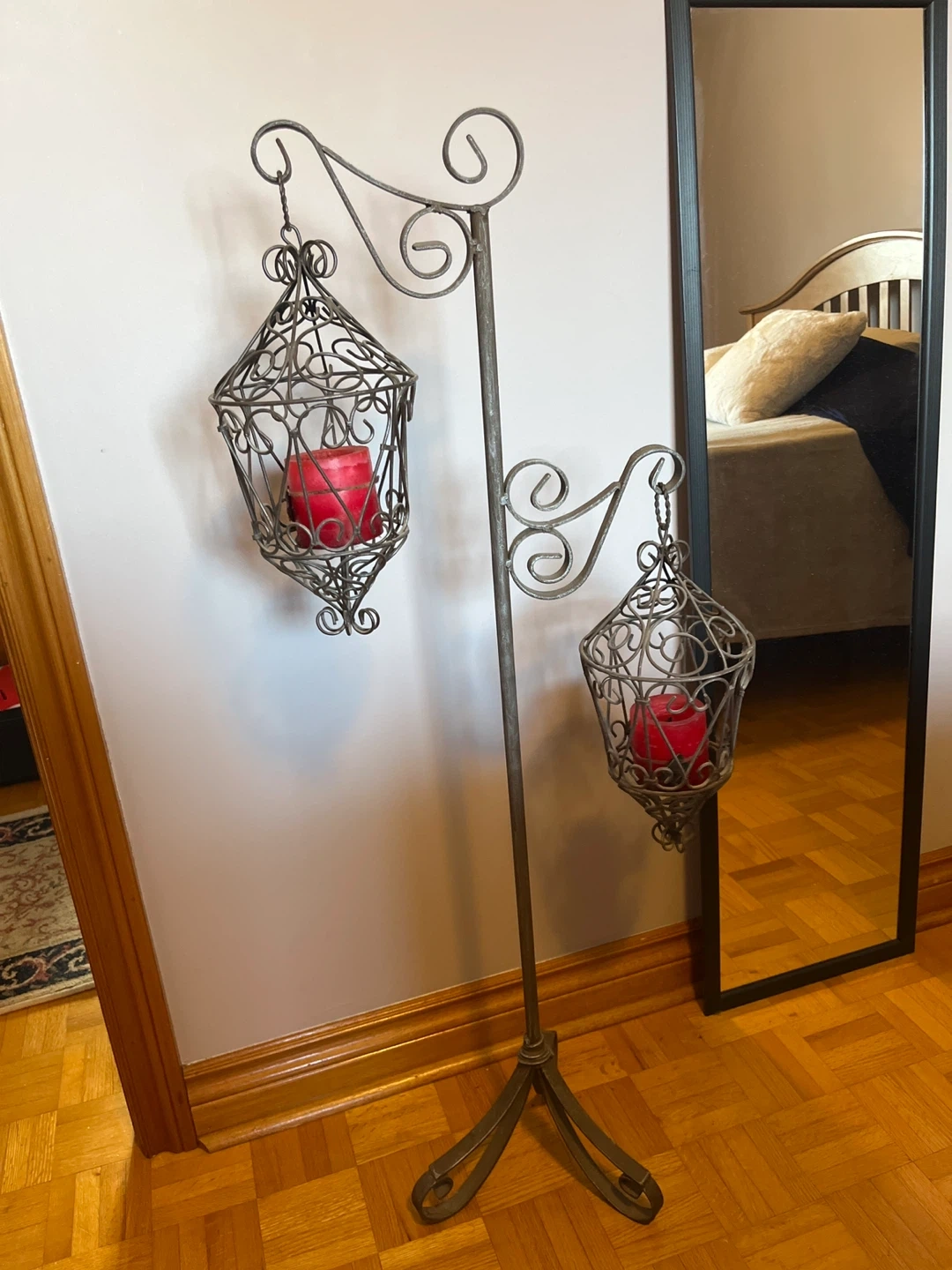 Ornate vintage metal floor candelabra. Features two decorative hanging lanterns, each holding a red pillar candle. Creates a warm ambiance. CASH only please.