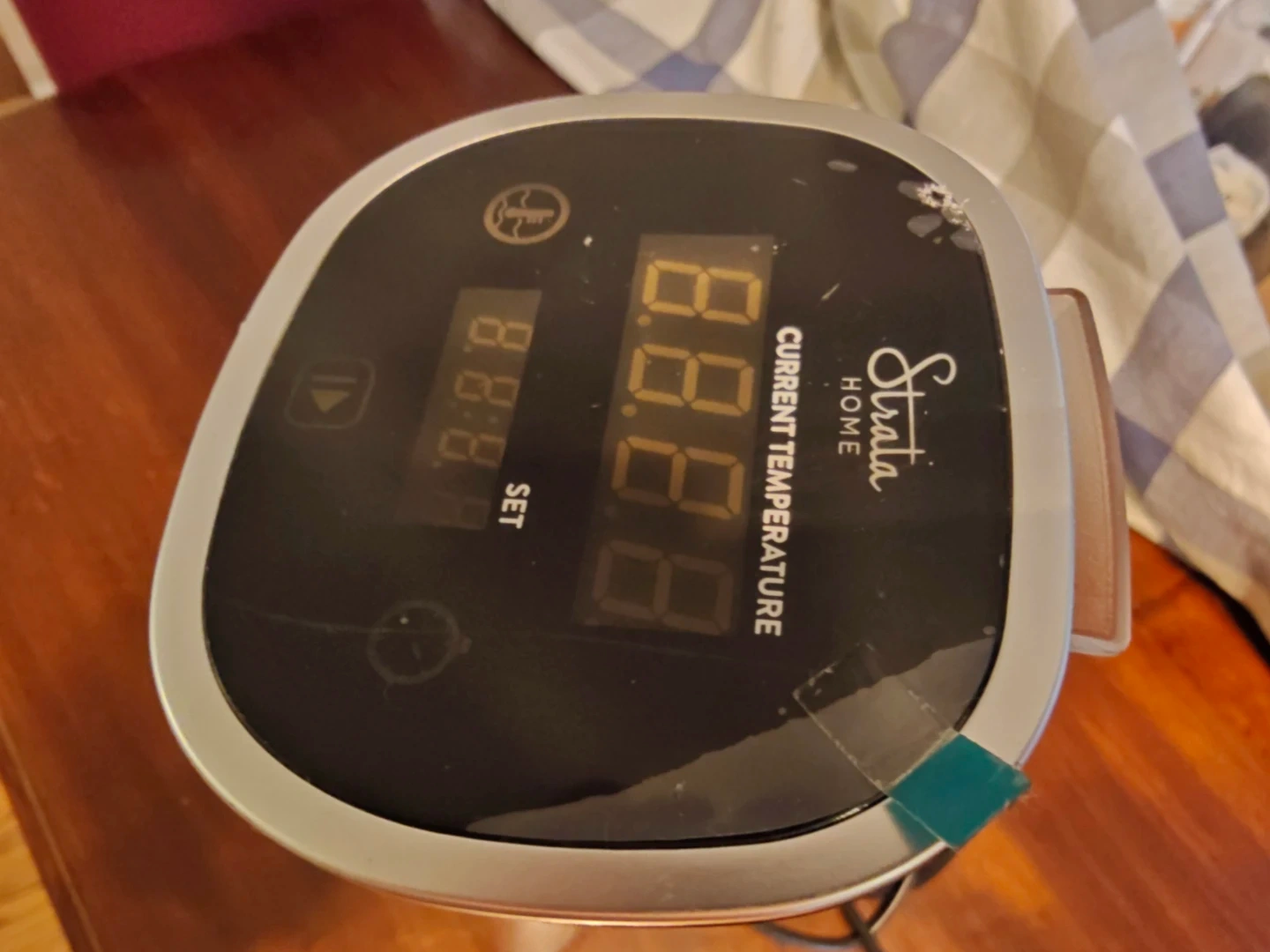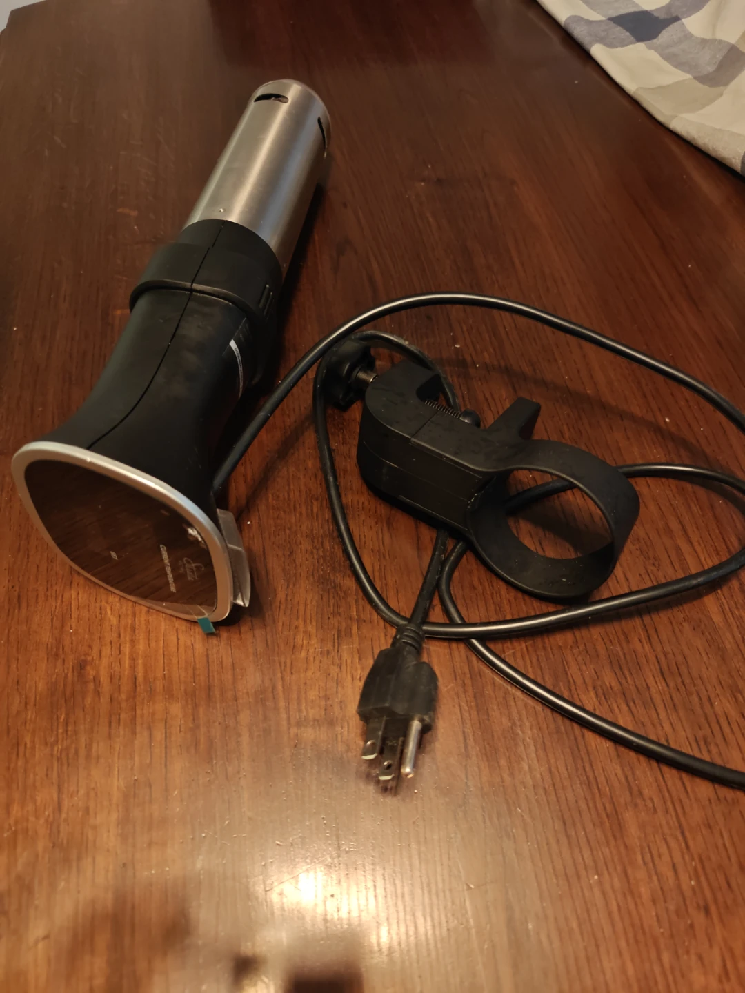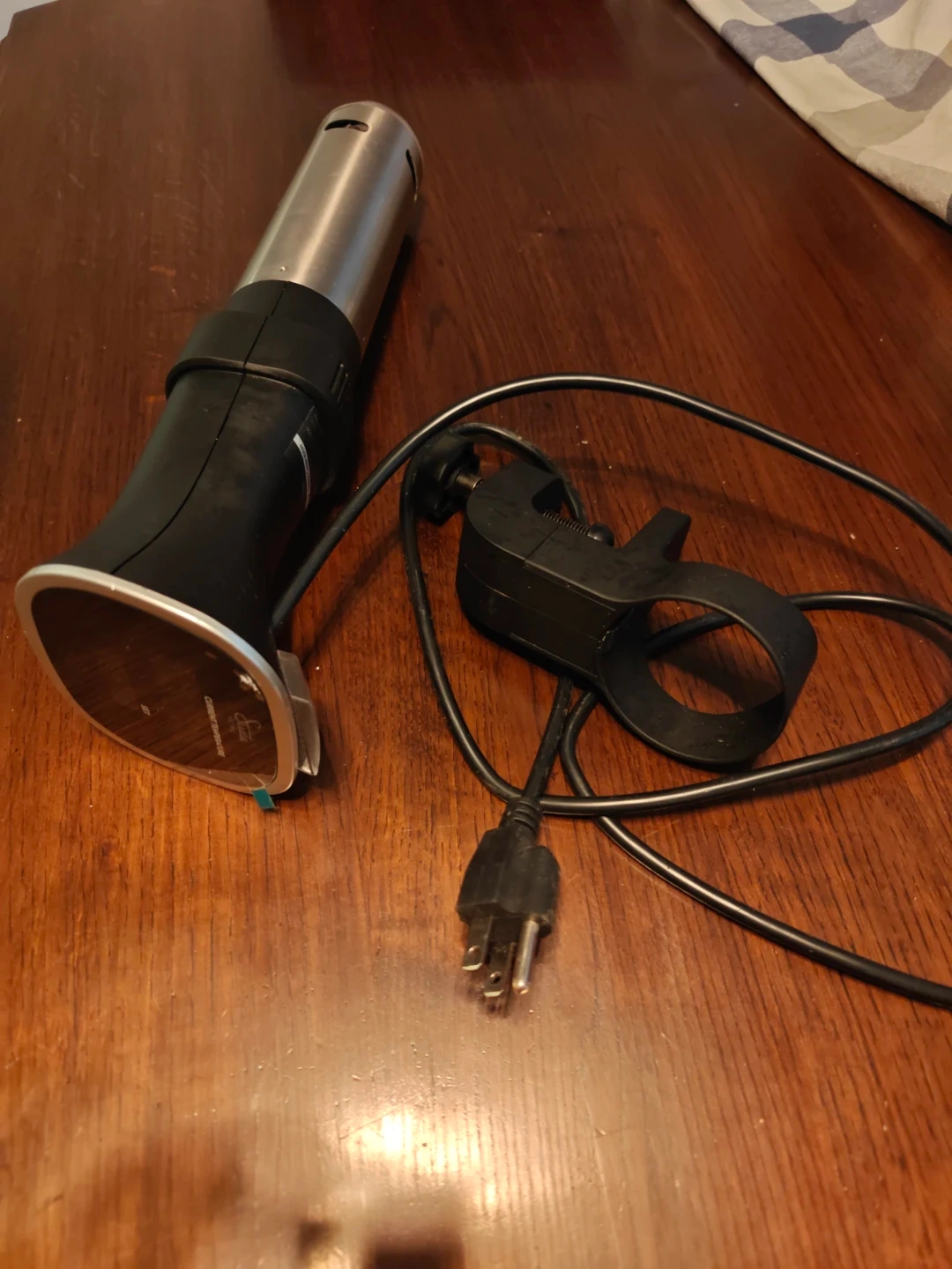 This Strata Home immersion circulator is designed for precise temperature control for sous vide cooking. It features a digital display showing the current temperature. This unit comes with its power cord and a mounting clip.