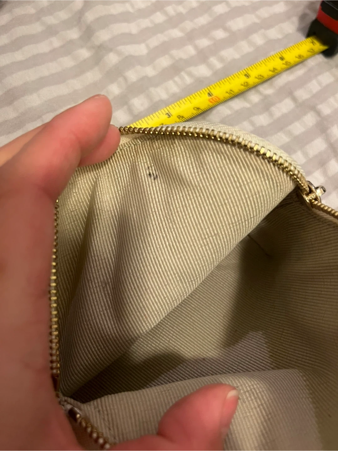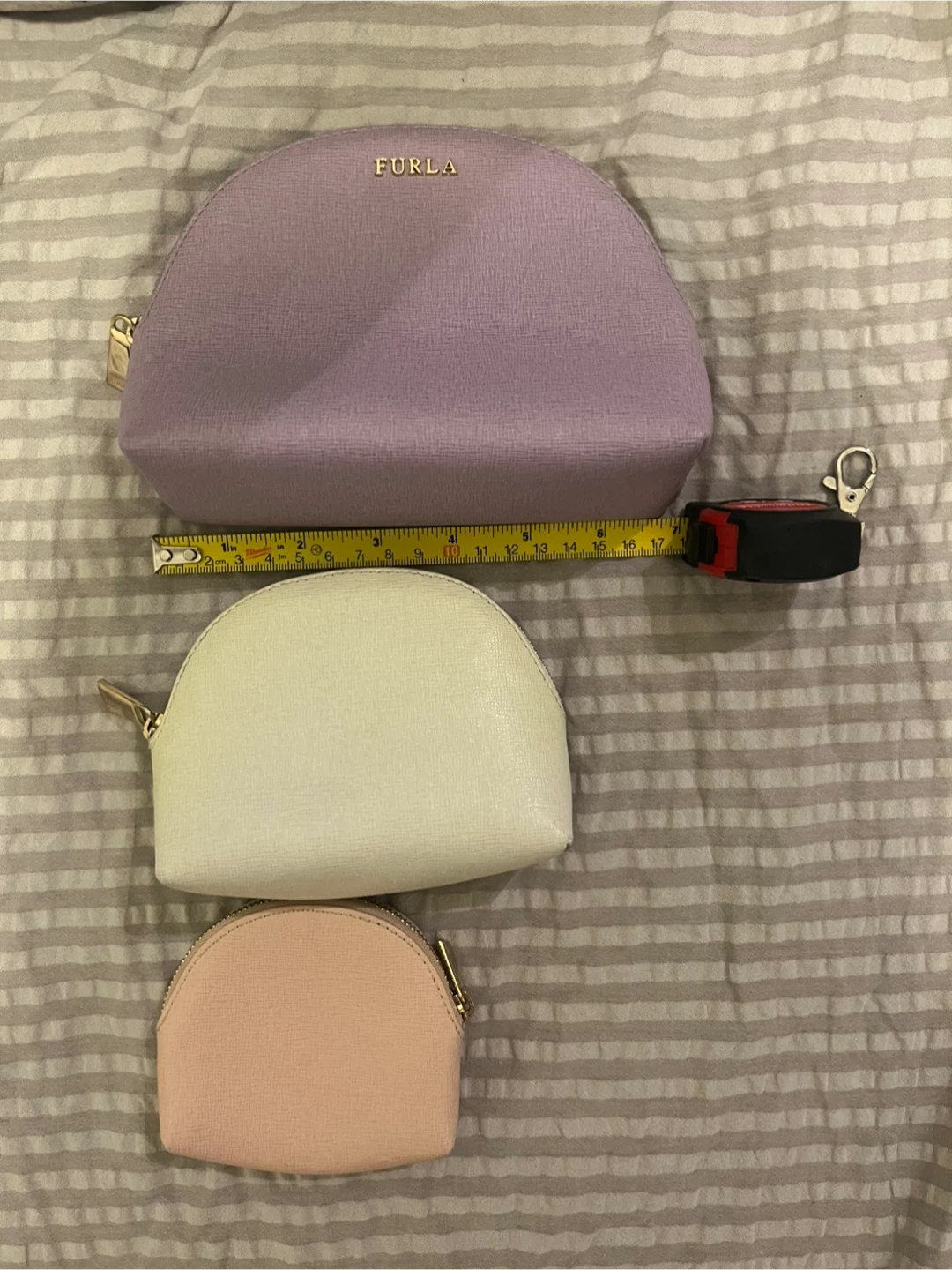 Set of three Furla cosmetic pouches in different colours. The largest pouch measures approximately 7 inches. They're made of a textured leather-like material. Interior has some minor marks.