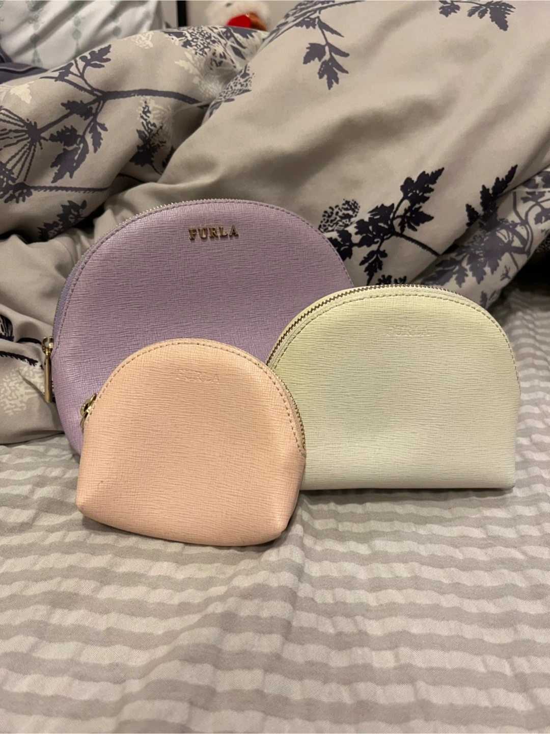Set of three Furla cosmetic pouches in different colours. The largest pouch measures approximately 7 inches. They're made of a textured leather-like material. Interior has some minor marks.