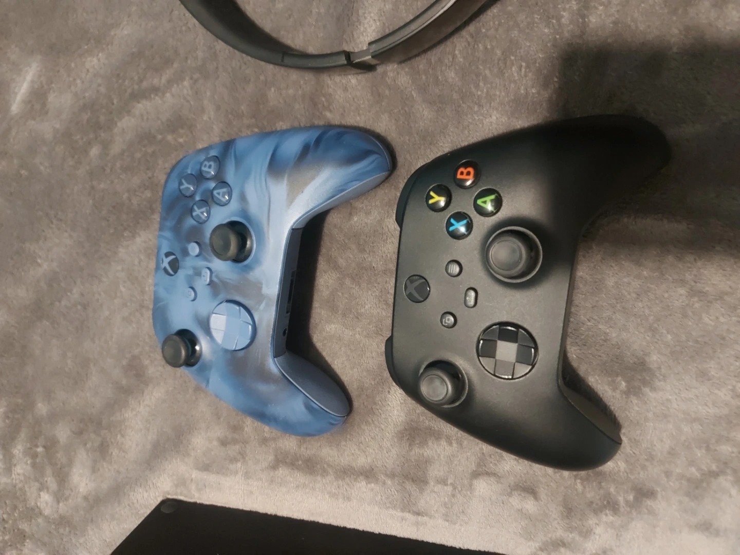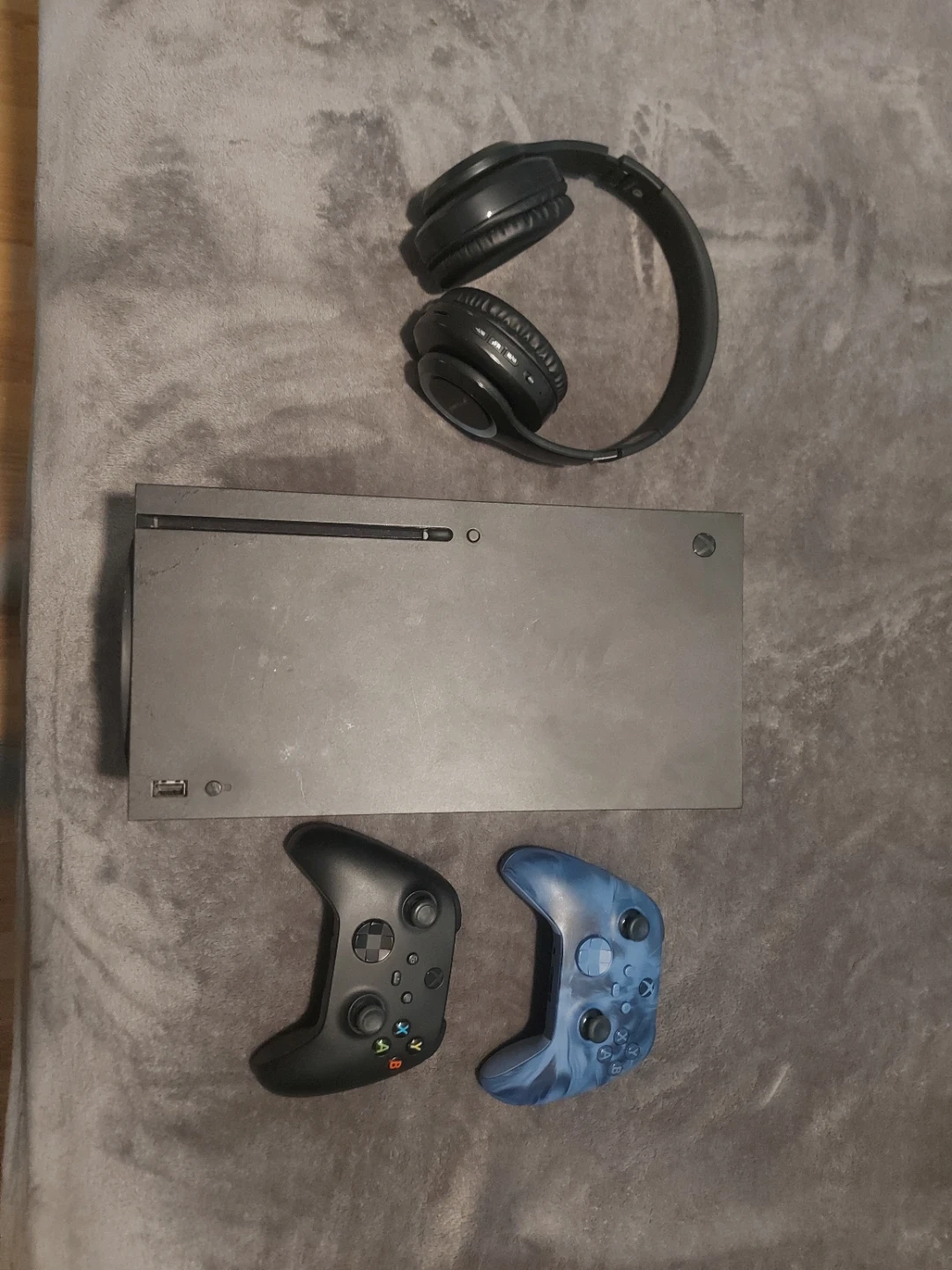 Includes an Xbox Series X console and two controllers, one black and one blue swirl. Also comes with black over-ear headphones. Ready for your next gaming session!