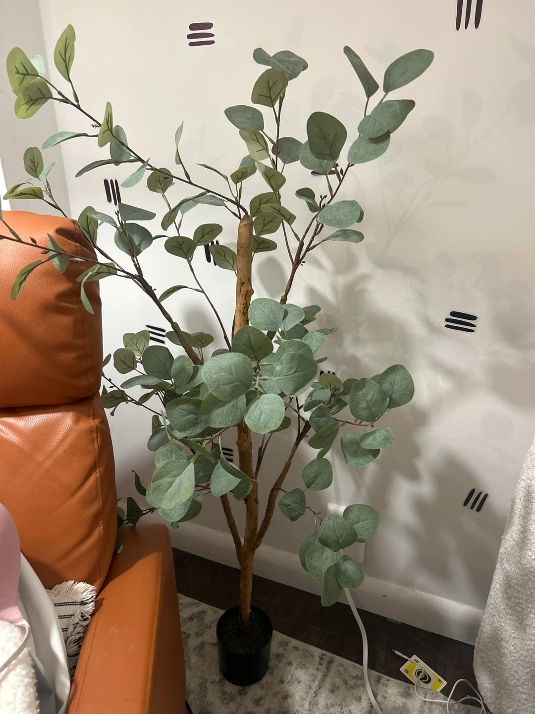 Add a touch of greenery to your space with this artificial eucalyptus tree. Its realistic leaves and natural-looking trunk bring a botanical feel indoors. The tree stands in a simple black pot, ready to complement any decor.