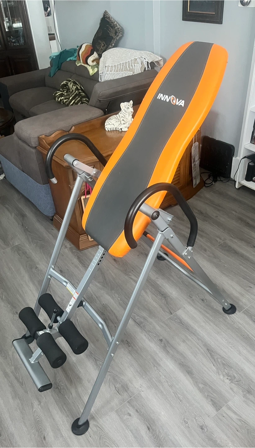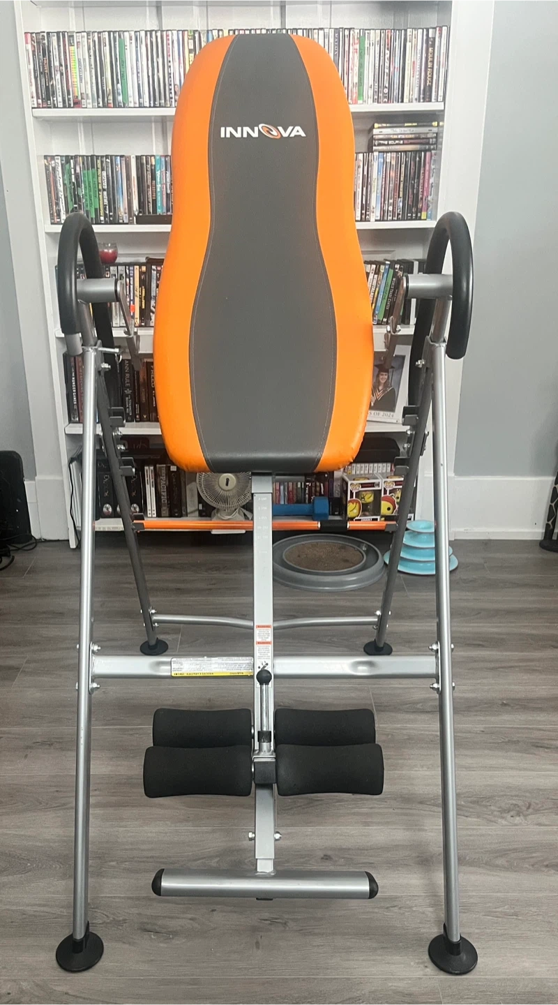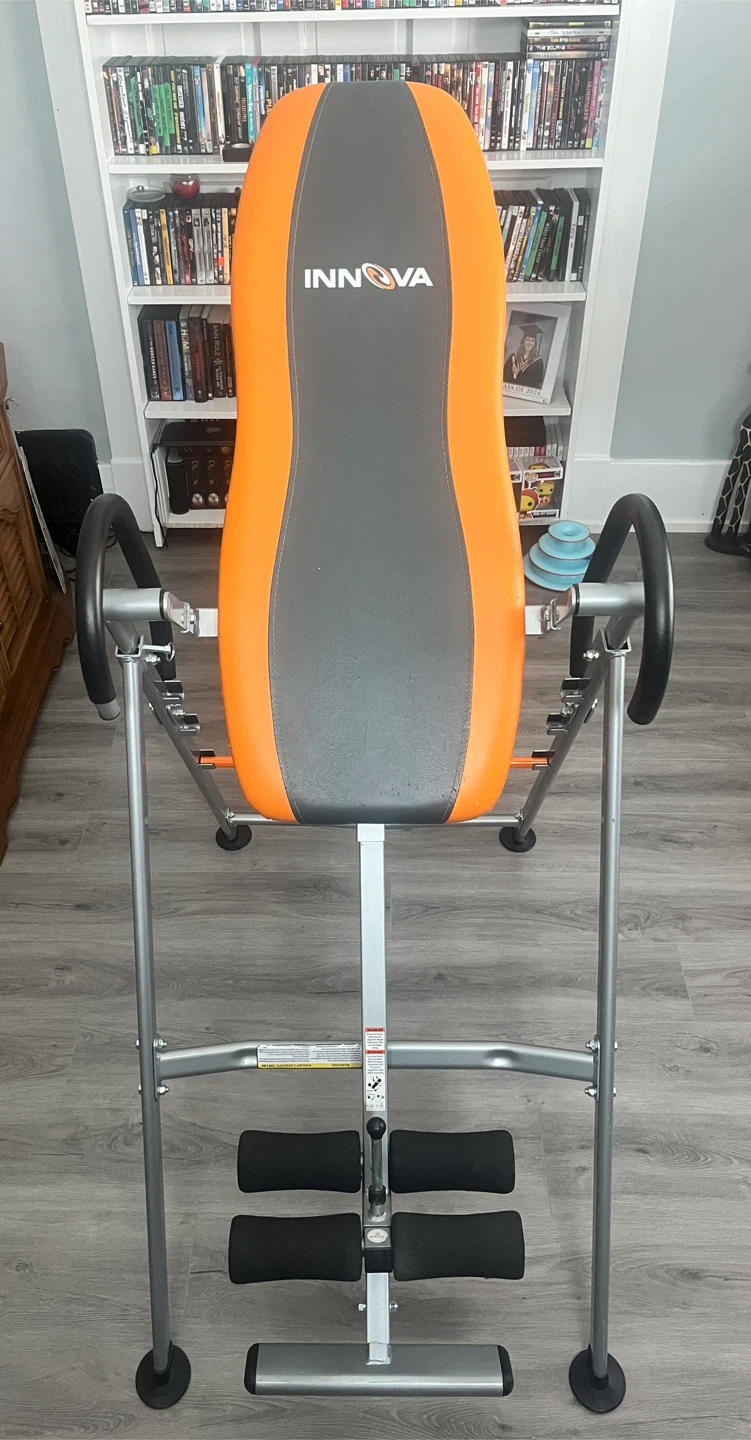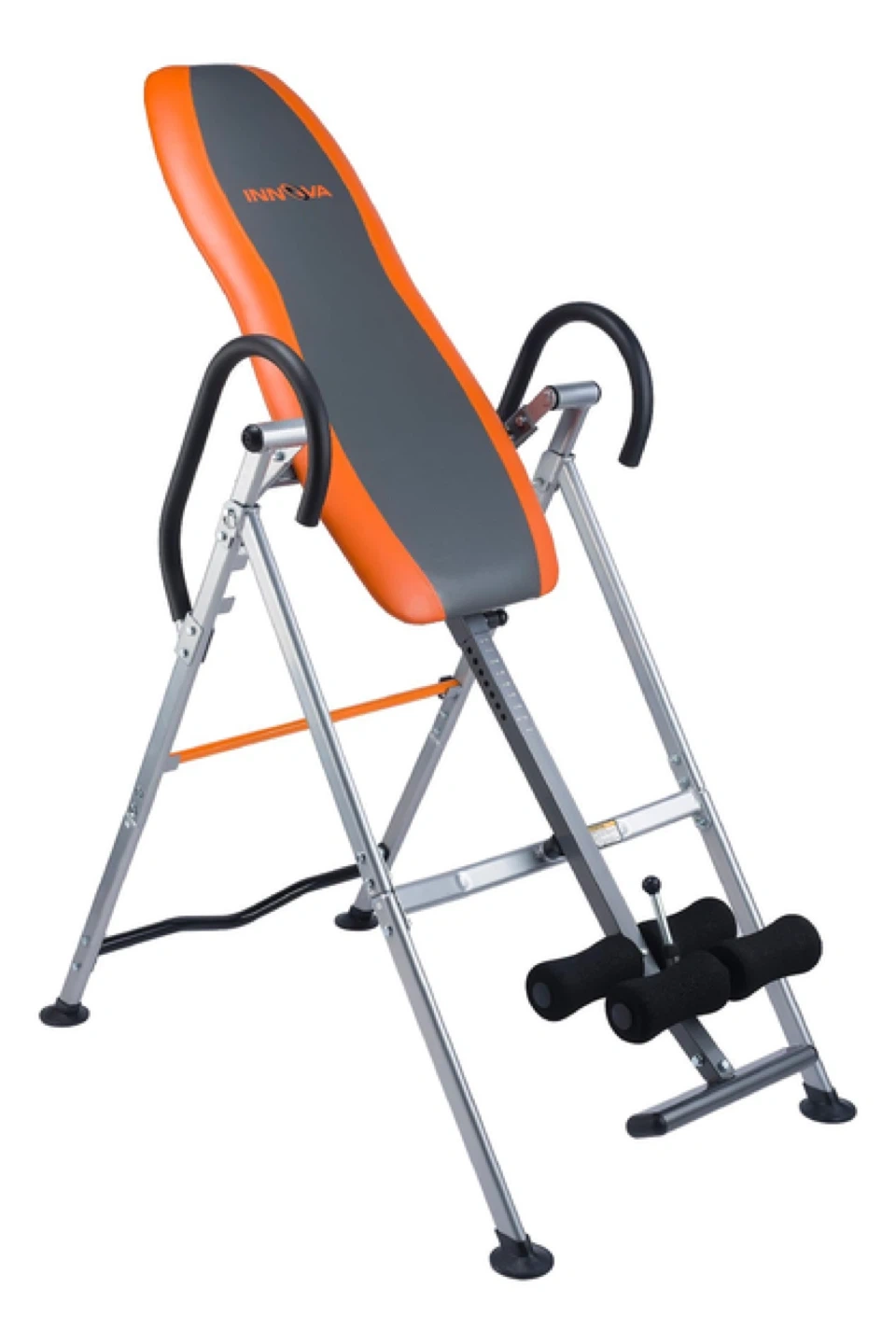 Innova ITX9600 inversion table in orange and grey. It features adjustable ankle supports and comfortable padding for a good inversion experience. This table is designed to help relieve back pain and decompress the spine. Folds up for easy storage and moving.