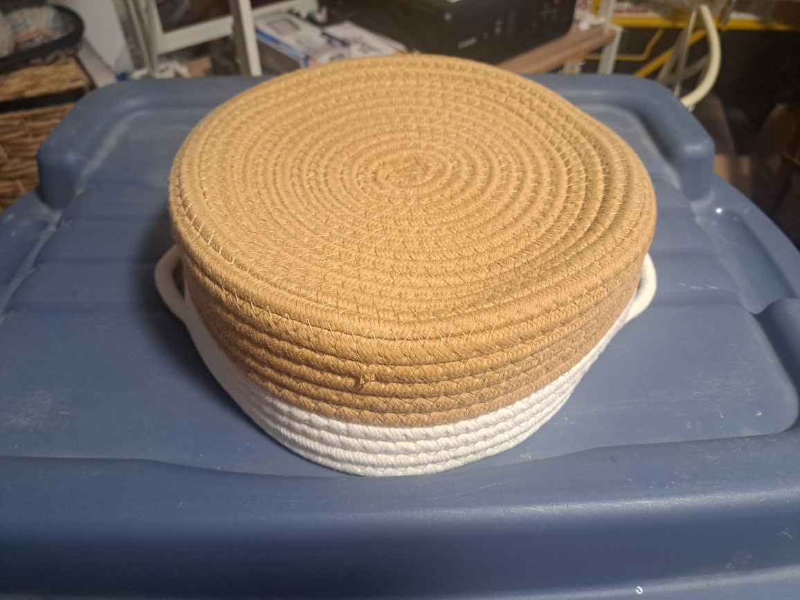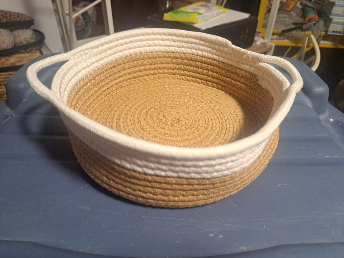 Here's a cute woven cotton rope basket, perfect for adding a touch of warmth to any room! It features a lovely combination of neutral tones, with a sturdy construction and convenient handles. Great for storing small items or displaying decorative pieces!