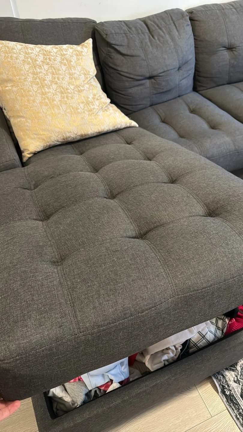 Comfortable grey sectional sofa with a tufted design. It includes a storage ottoman, perfect for stashing blankets or pillows. Offers ample seating for your living space.
