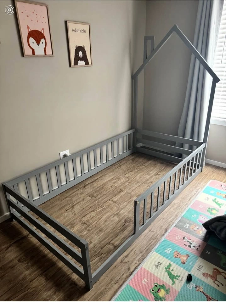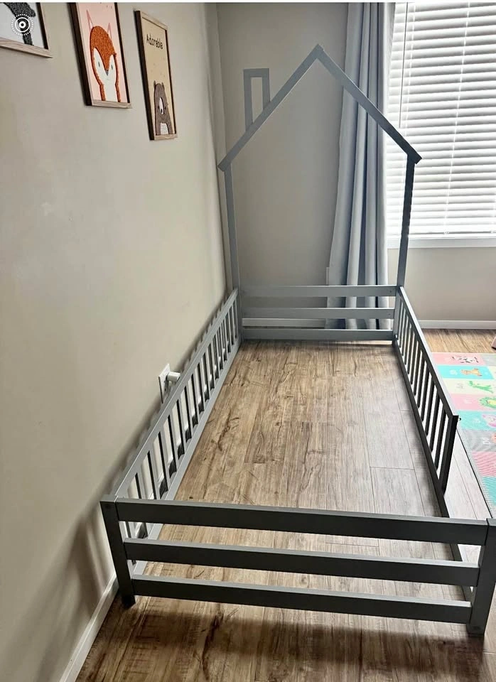 A grey wooden toddler bed frame designed like a house. It includes safety rails to prevent little ones from rolling out. This bed frame's design makes transitioning from a crib easier!