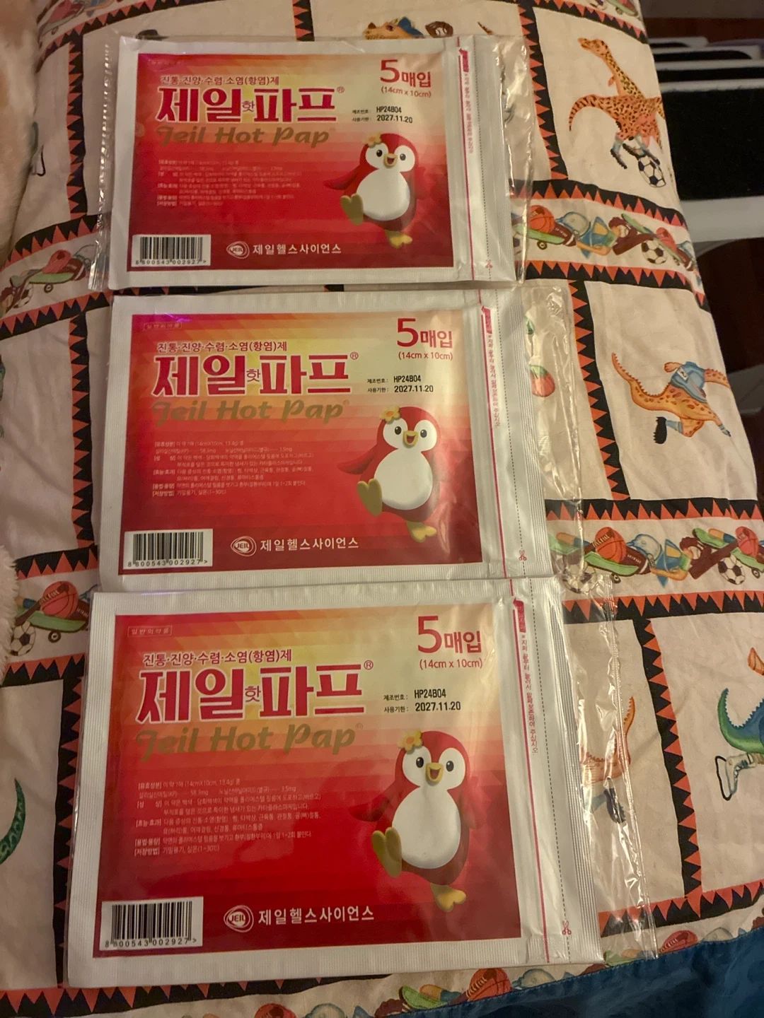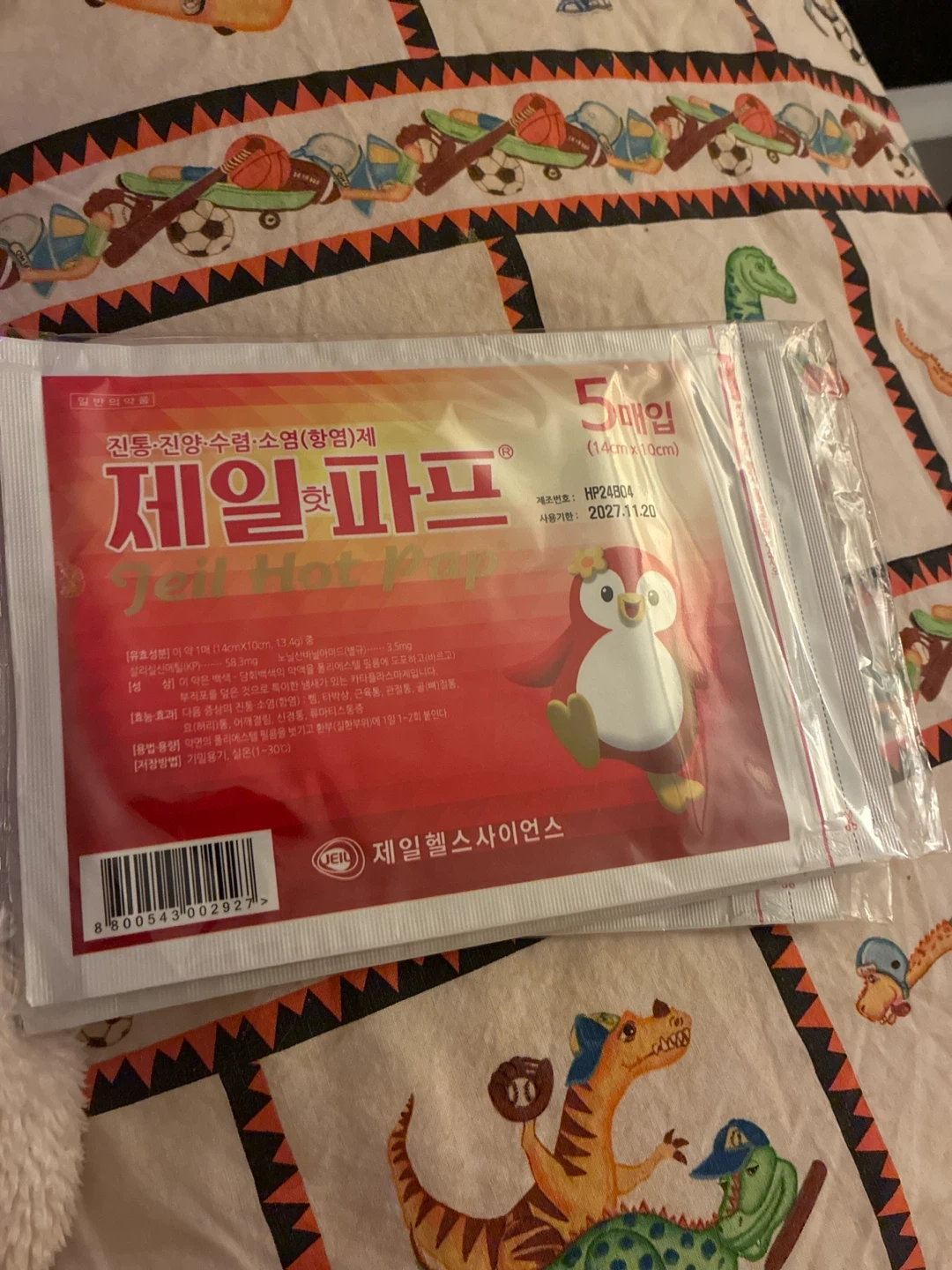These are Jeil Hot Pap warm packs. Each pack contains 5 individual warmers, measuring 14cm by 10cm. The expiration date is November 20, 2027. They provide soothing warmth.