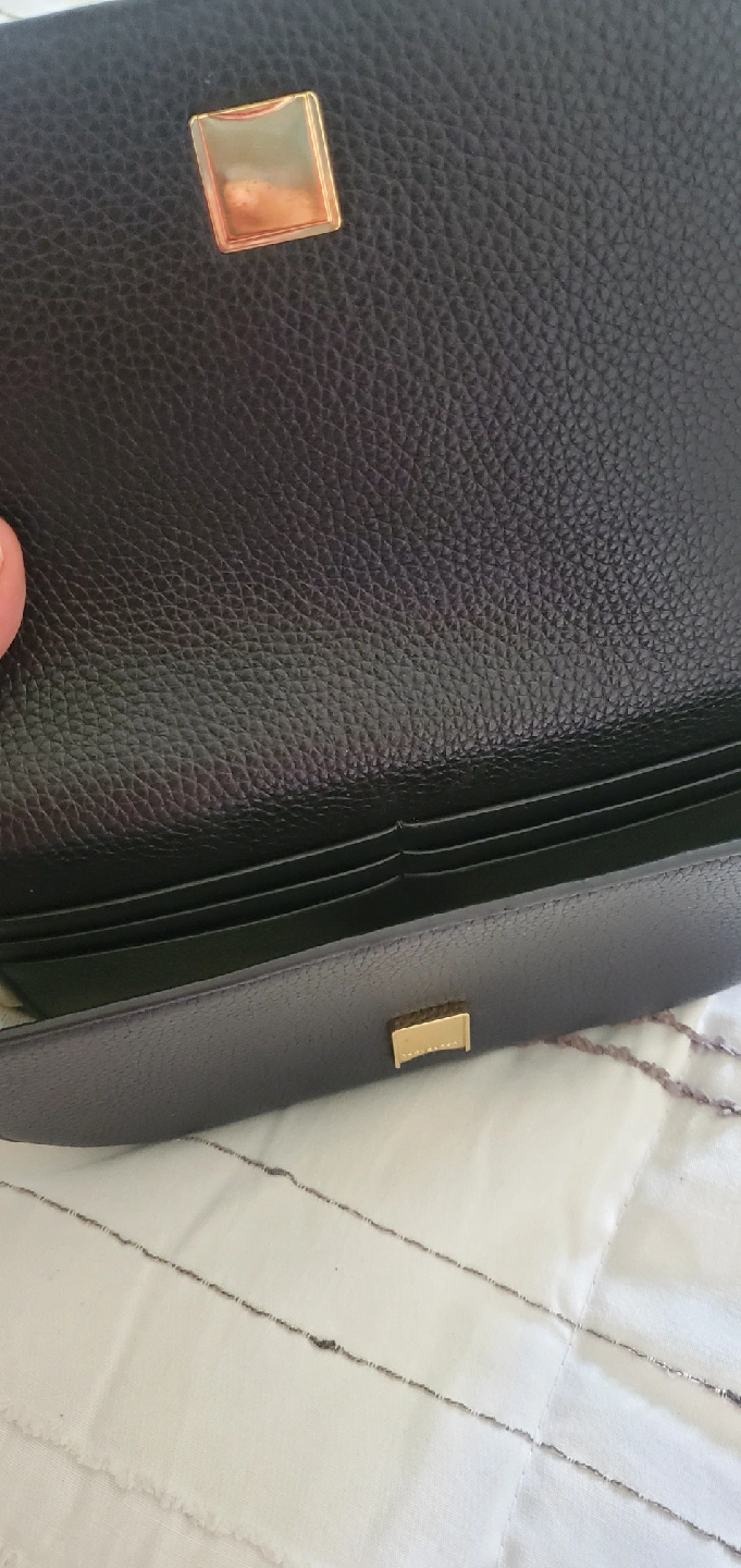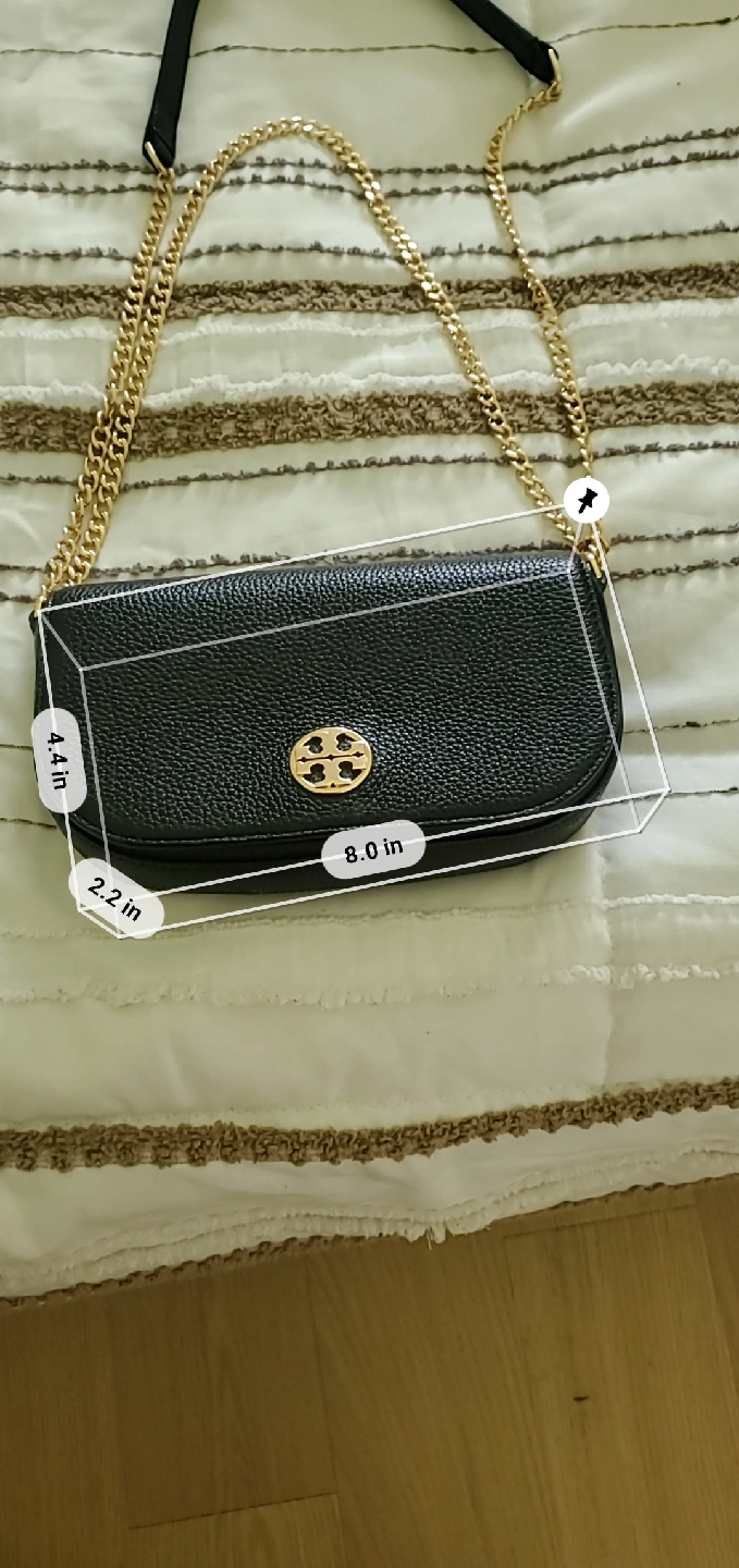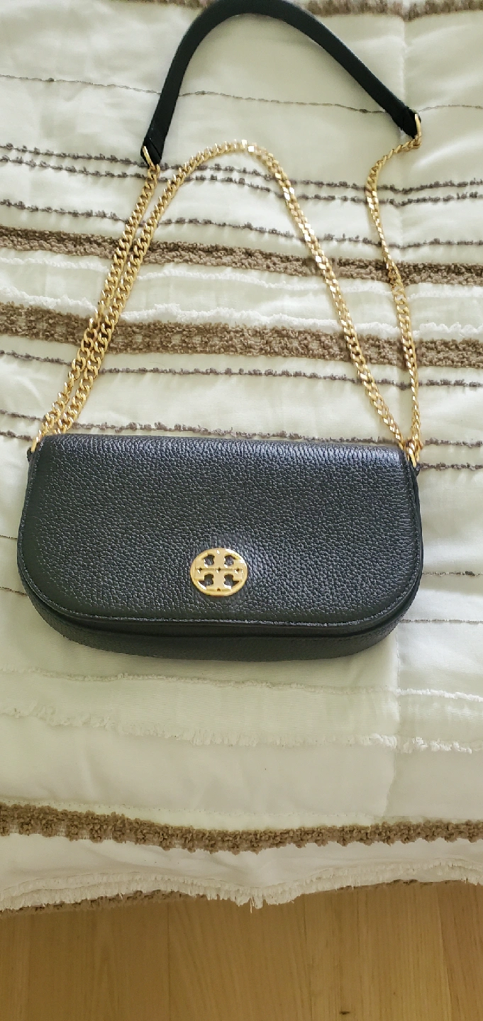 This is a Tory Burch black leather shoulder bag with a gold chain strap. The approximate dimensions are 8 inches wide, 4.4 inches high, and 2.2 inches deep. The bag also features the Tory Burch logo on the front.
