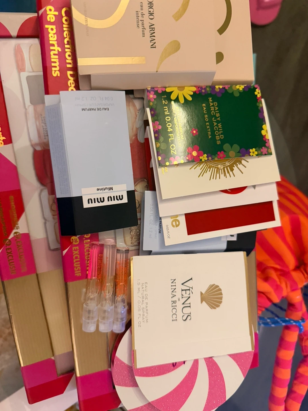 A collection of assorted designer perfume samples including Giorgio Armani, Marc Jacobs Daisy, Nina Ricci Venus, and Miu Miu. Sizes range from 1.2 ml to 1.5 ml.