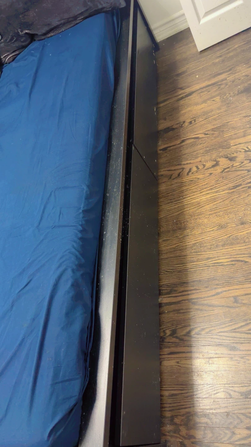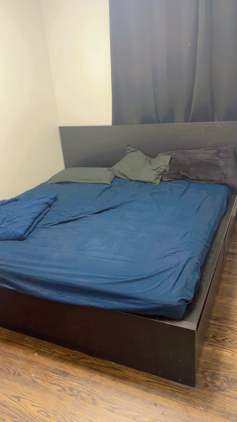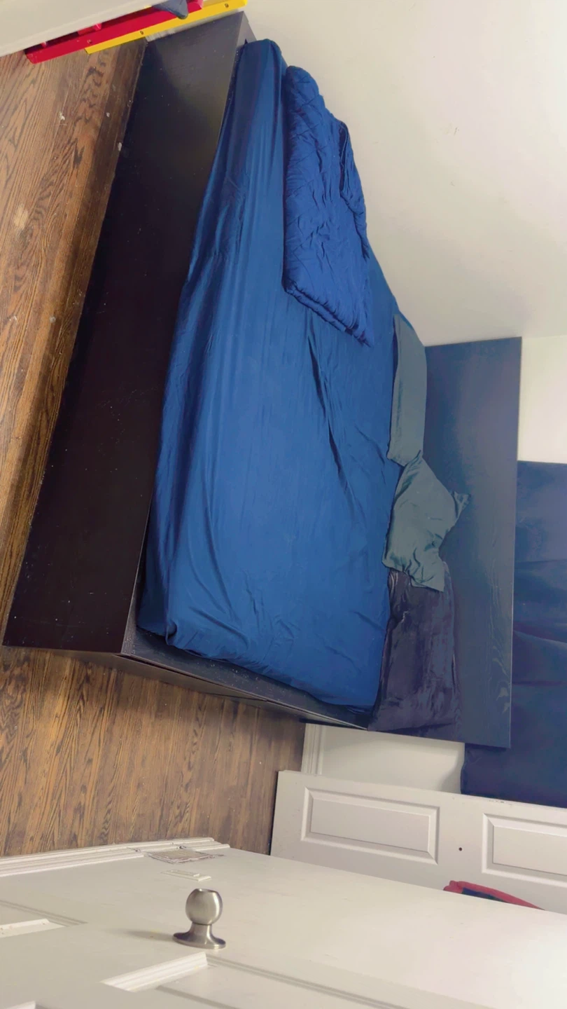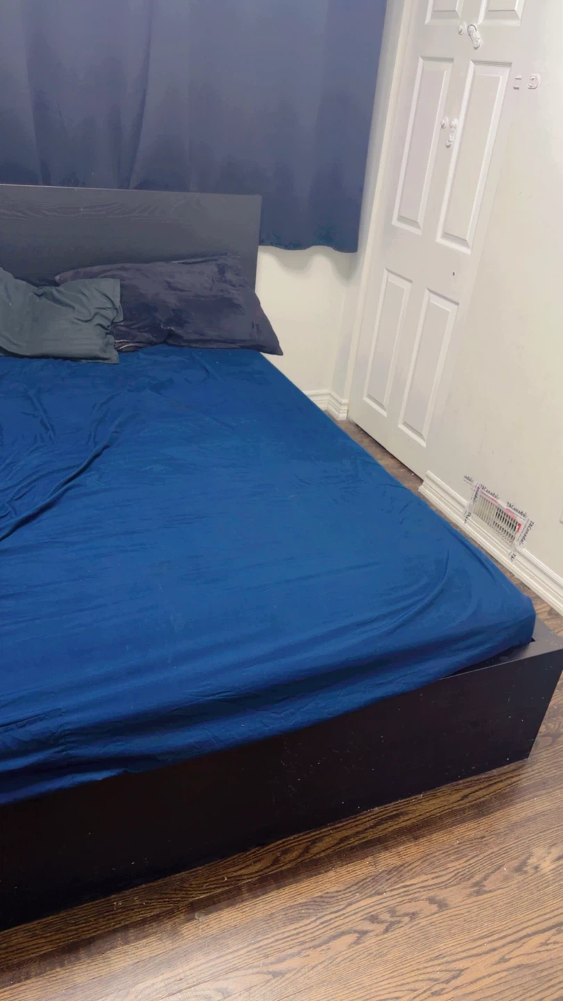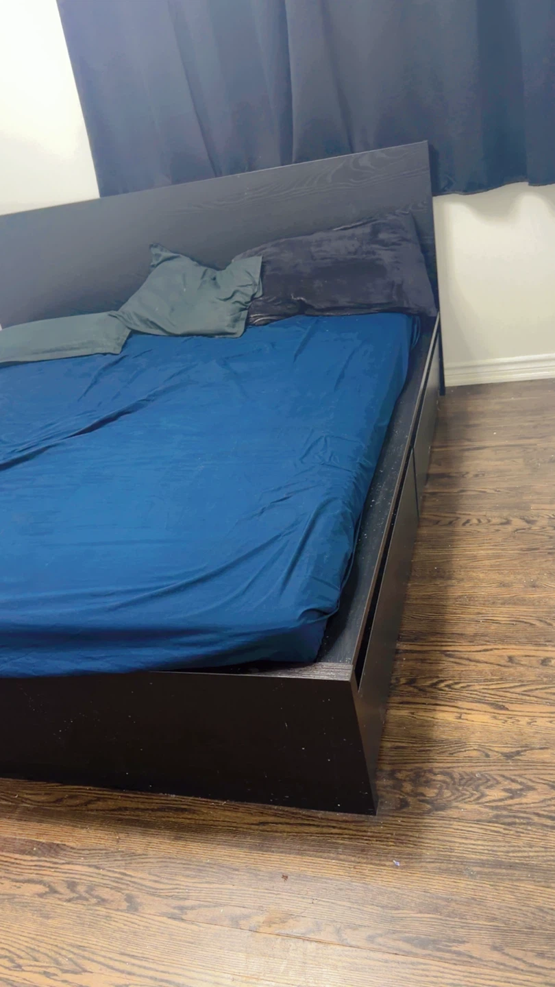 Selling a ikea king-size bed frame in dark brown. It's in good condition and ready for a new home. The bed frame has a simple and modern design, perfect for any bedroom. If you're looking for an affordable and stylish bed frame, this is it!