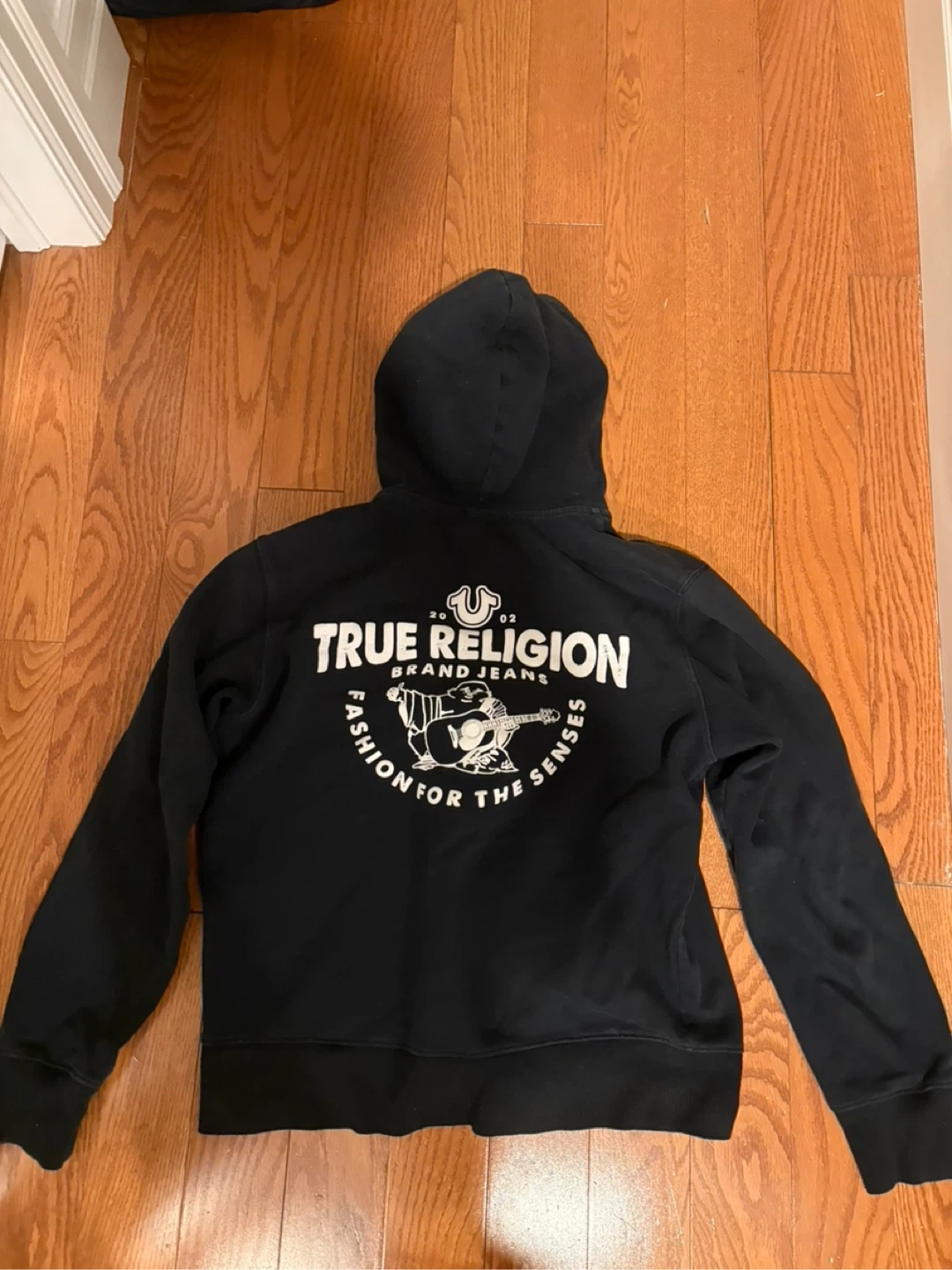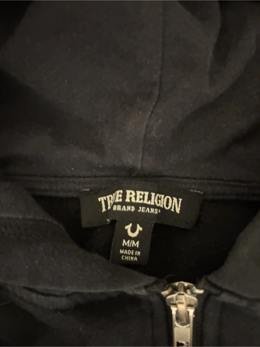 Black True Religion zip-up hoodie with logo on front and graphic on back. Size M/M. Made in China.