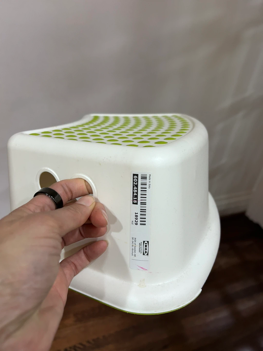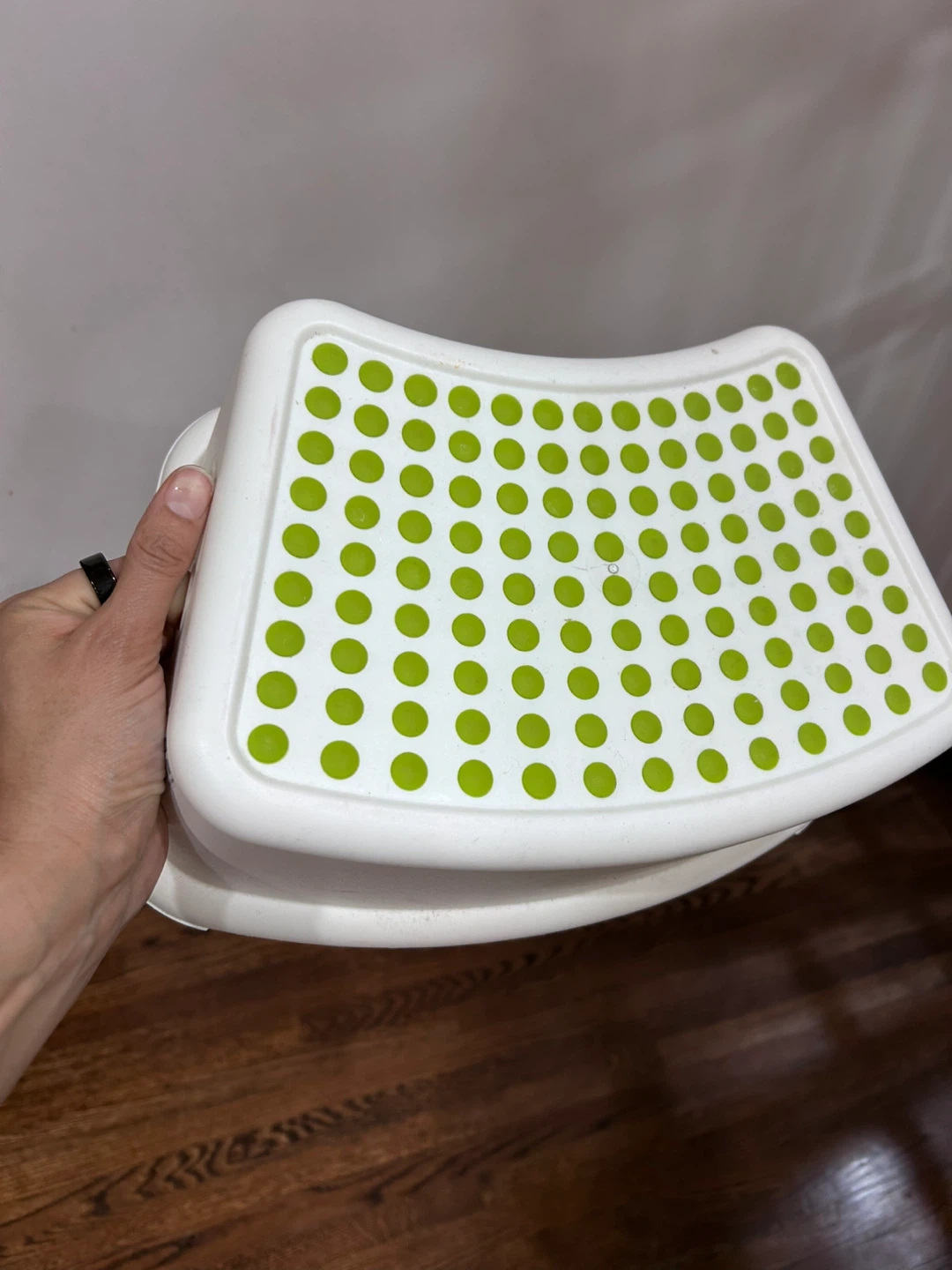 This is a white children's step stool with a green polka dot grip. It's made of plastic and is sturdy for little ones. It's perfect for reaching things on counters or the sink.
