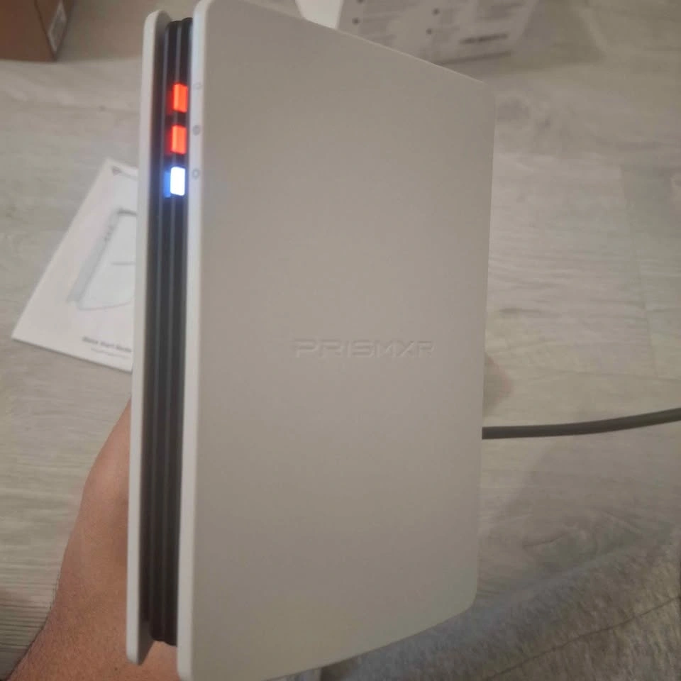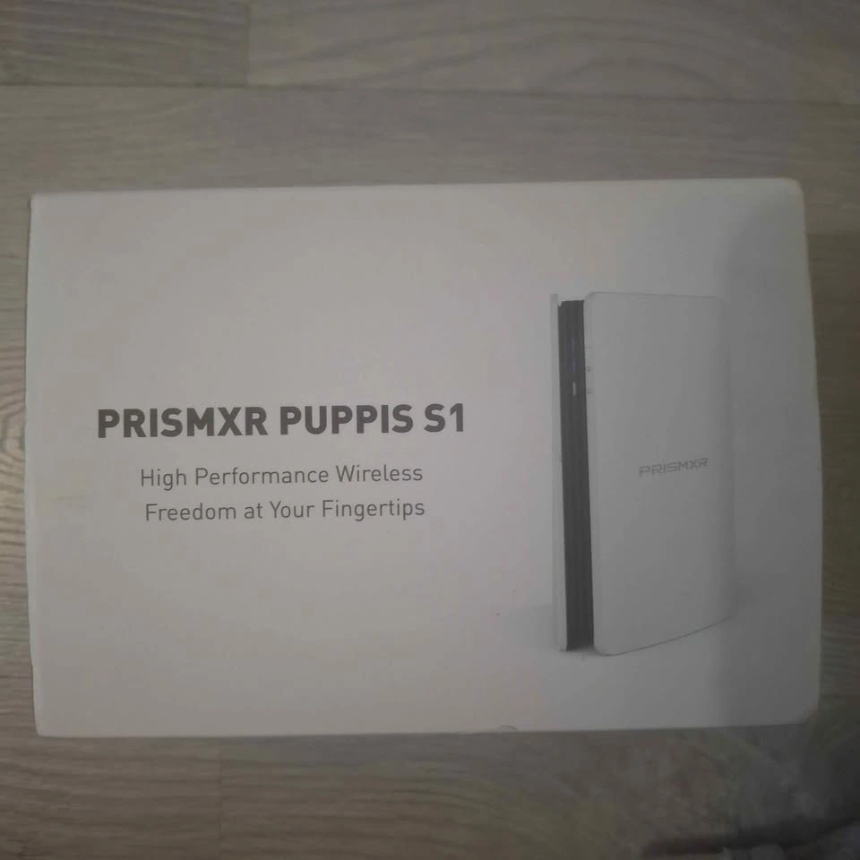 Portable PRISMXR AX3000 WiFi6 router for PC VR streaming. Dedicated router, up to 3000 Mbps, with stable, fast wireless connection. Compatible with Meta Quest 3S/3/2 and Pico 4/Ultra headsets. Works with Windows 10/11 and software like Steam VR. Lightweight, ultra portable. Dimensions are 6.61in x 4.64in x 3.54in.