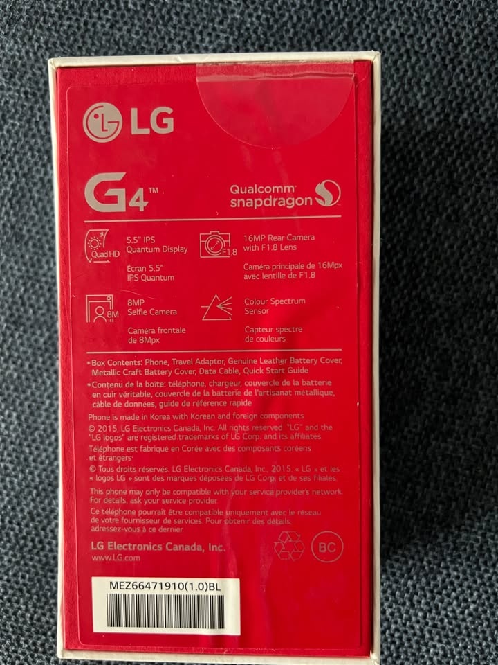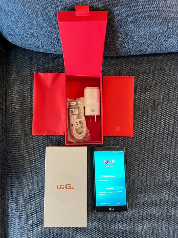 Brand new, never used LG G4 cell phone with a genuine leather back. Received as a free phone from my carrier but never used it as I already had an iPhone. The phone is brand new and still has the original stickers attached. Pick up in Point Grey, V6R2J5.