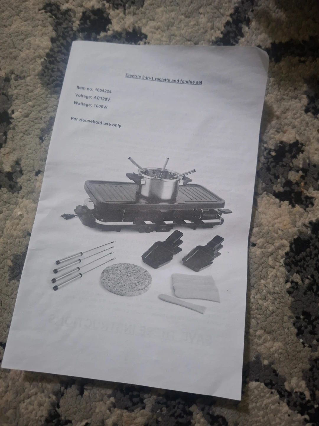 This electric 3-in-1 set includes a raclette grill and a fondue pot. It comes with spatulas, skewers, and a scraper. Wattage is 1600W and voltage is AC120V.