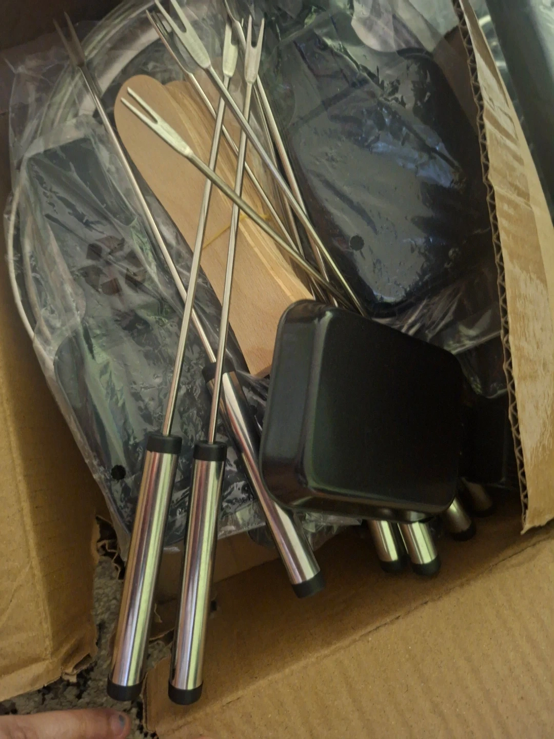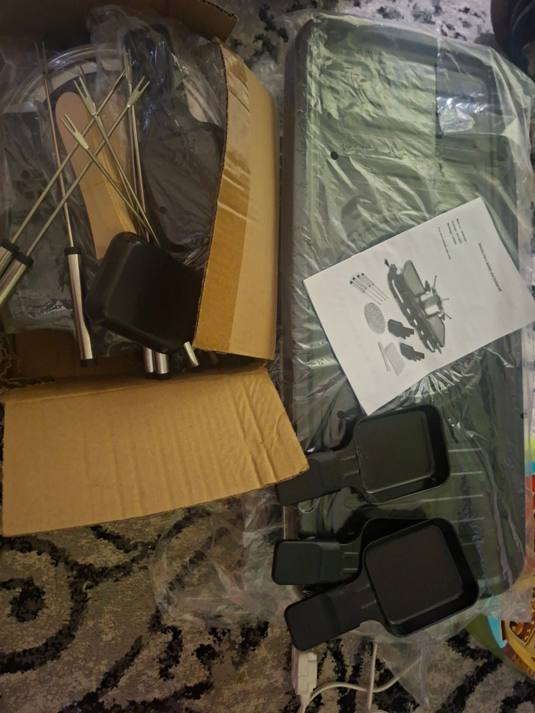 This electric 3-in-1 set includes a raclette grill and a fondue pot. It comes with spatulas, skewers, and a scraper. Wattage is 1600W and voltage is AC120V.