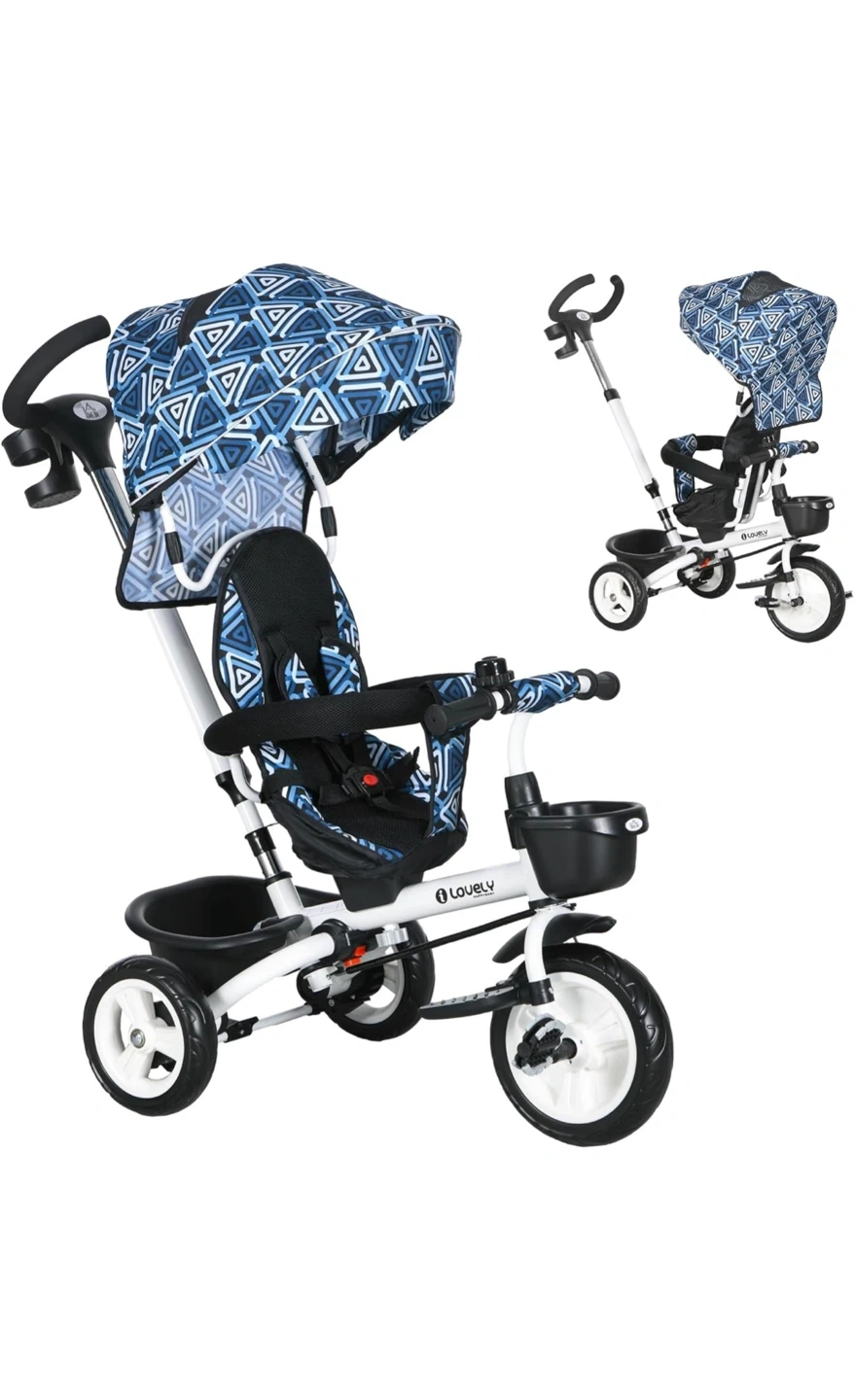 Brand new in box Qaba 6-in-1 toddler tricycle offers versatile configurations to grow with your child. It features a parent push handle, canopy, safety guardrail, and a 5-point safety belt. Dimensions are 44.1" (112 cm) long, 19.7" (50 cm) wide, and 40.9" (104 cm) high. Recommended for ages 12-60 months.