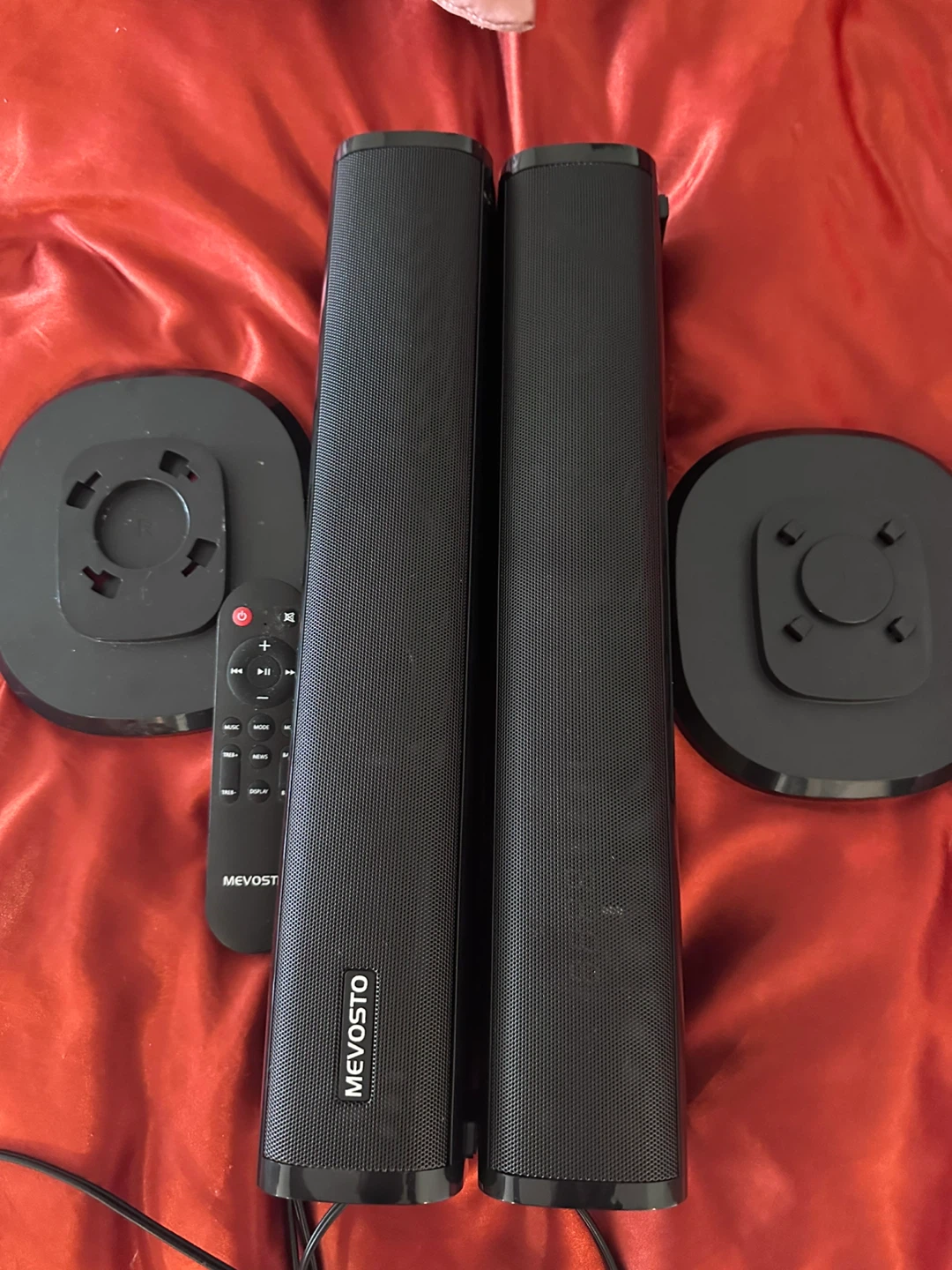 Selling a set of MEVOSTO sound bar speakers. They come with their stands and a remote control for easy operation. Perfect for enhancing your audio experience!