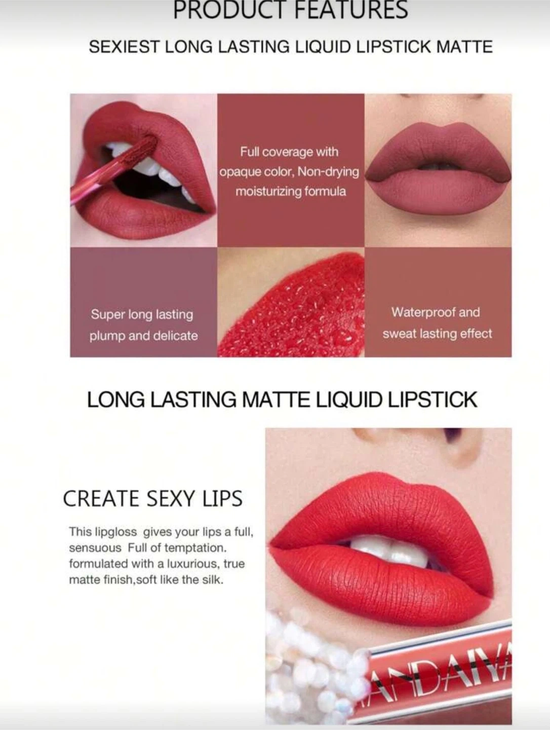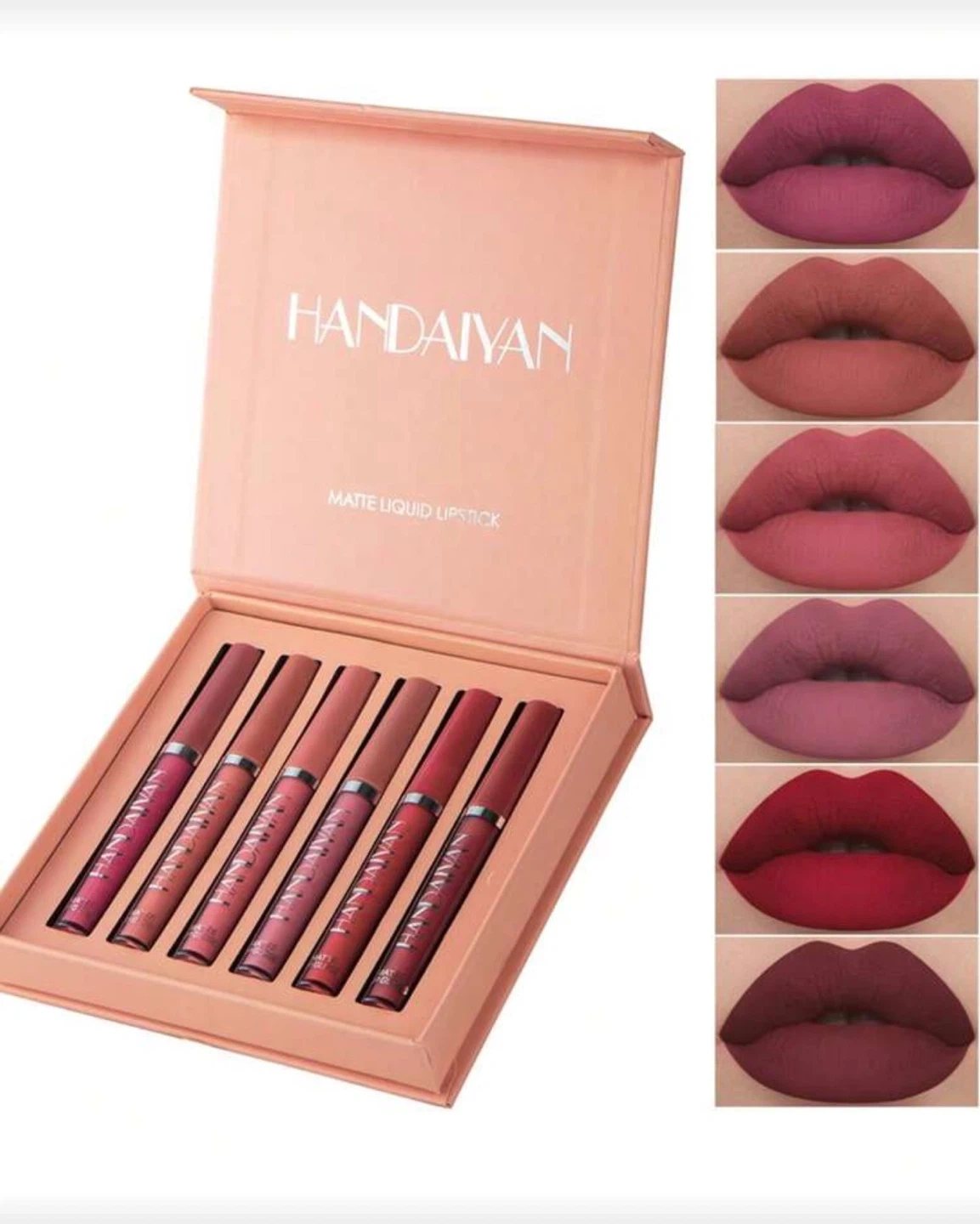 This set features six long-lasting matte liquid lipsticks in various shades. They're waterproof and sweat-lasting with a non-drying moisturizing formula for full coverage. This lip gloss set gives your lips a full, sensuous look with a true matte finish.