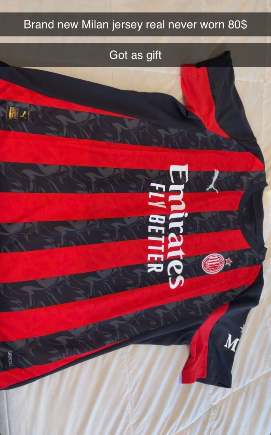 Brand new AC Milan football jersey, never worn. Features 'Emirates Fly Better' sponsor. DryCell technology for moisture-wicking. Got as a gift.
