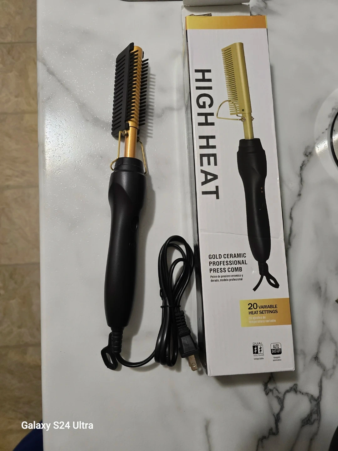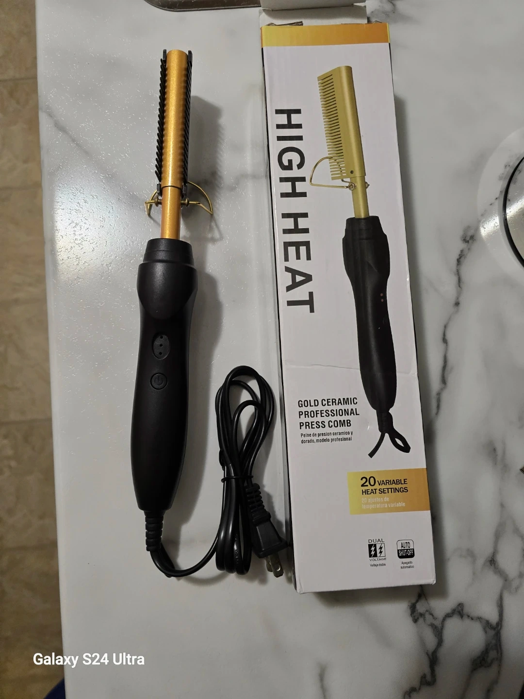 High heat gold ceramic press comb with 20 variable heat settings. Automatic shut-off included. Dual voltage operation.