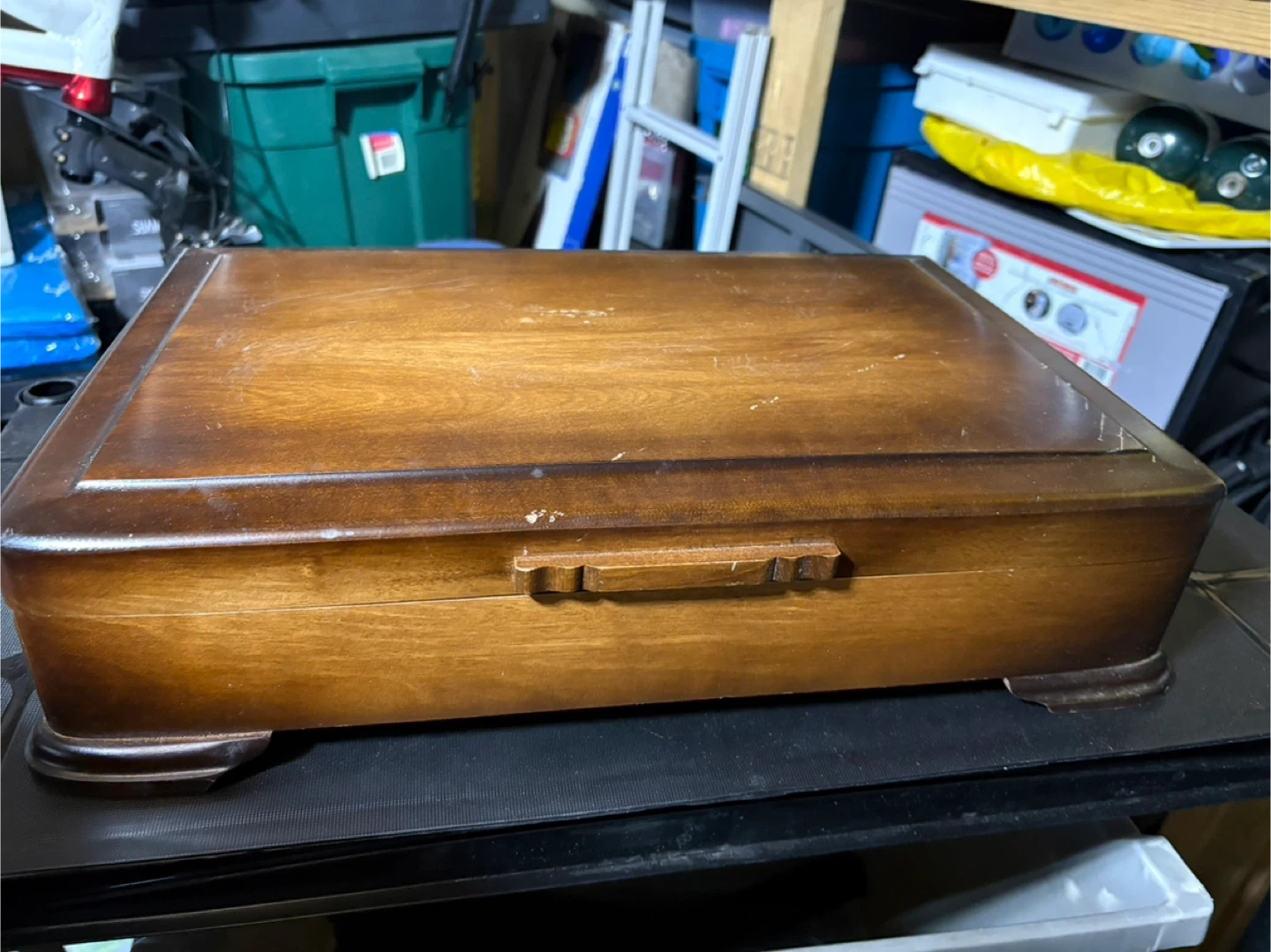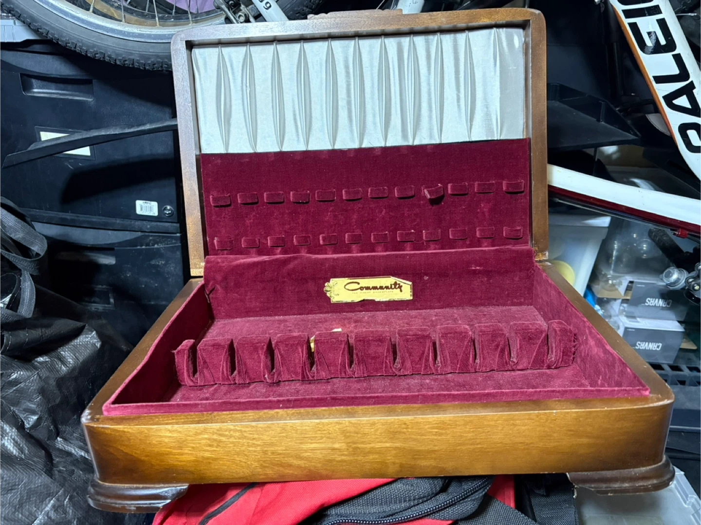 This vintage wooden cutlery box. It's designed to hold silverware and keep it organized. The interior is lined with red velvet for protection. In OK condition, maybe you can fix it up or just use it as a box.
