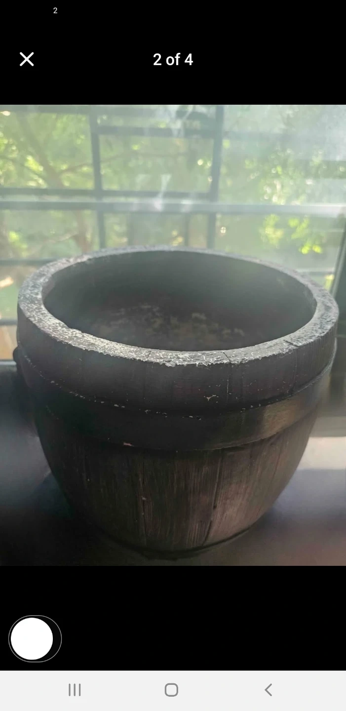 This barrel-shaped planter pot has a rustic design. It's made from a durable material with a textured finish. It's great for housing small plants indoors or outdoors!