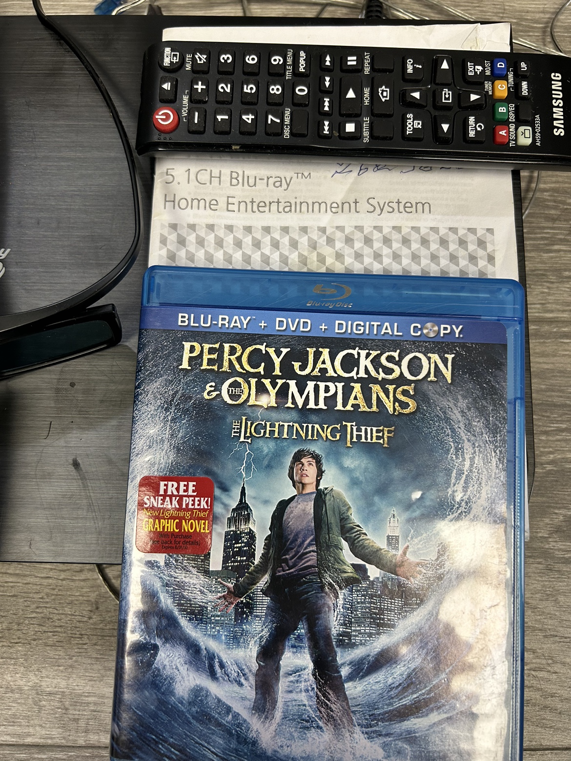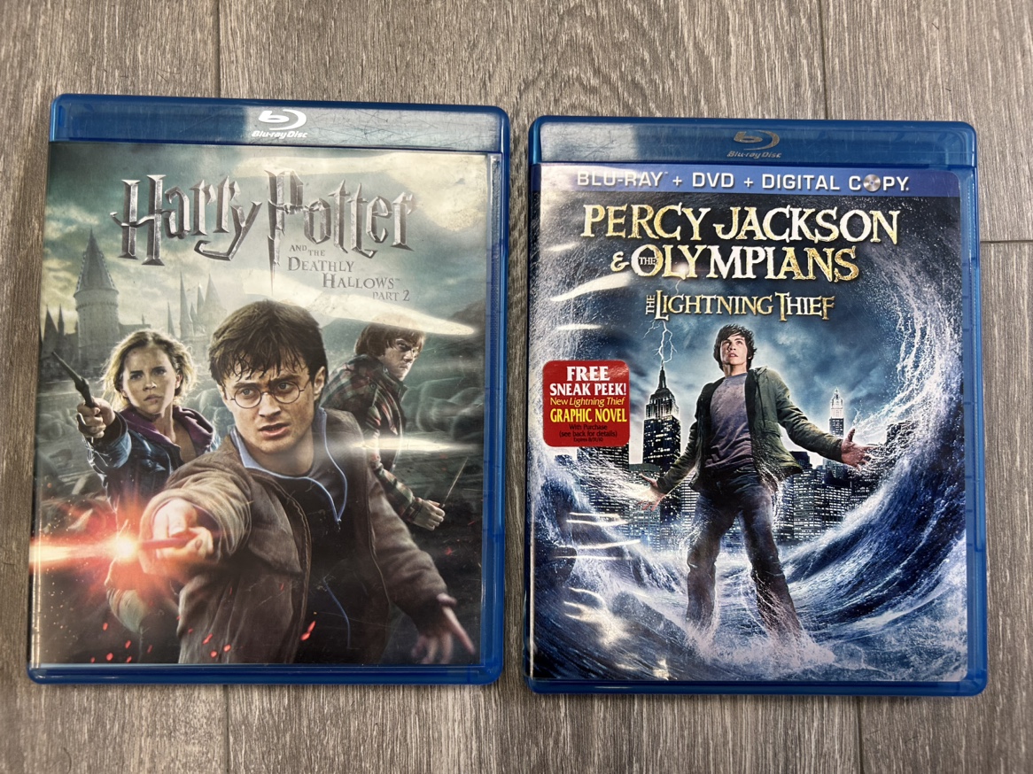 Two Blu-ray movies. Both come with a DVD and a digital copy. One is Harry Potter and the Deathly Hallows Part 2. The other is Percy Jackson and the Olympians: The Lightning Thief.
