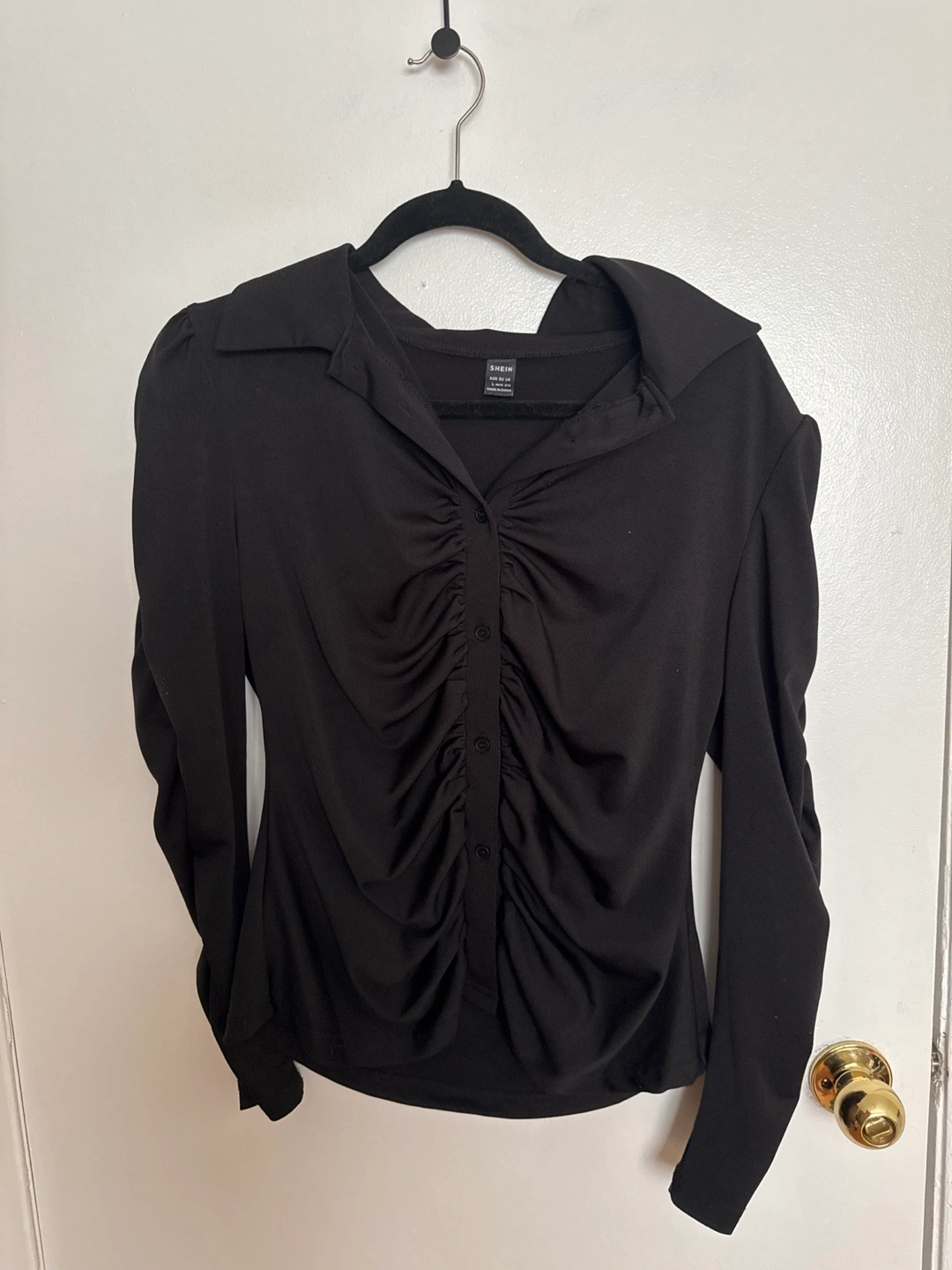Long sleeve black blouse. Features ruched detailing and collared neckline. Button front closure. Size large.