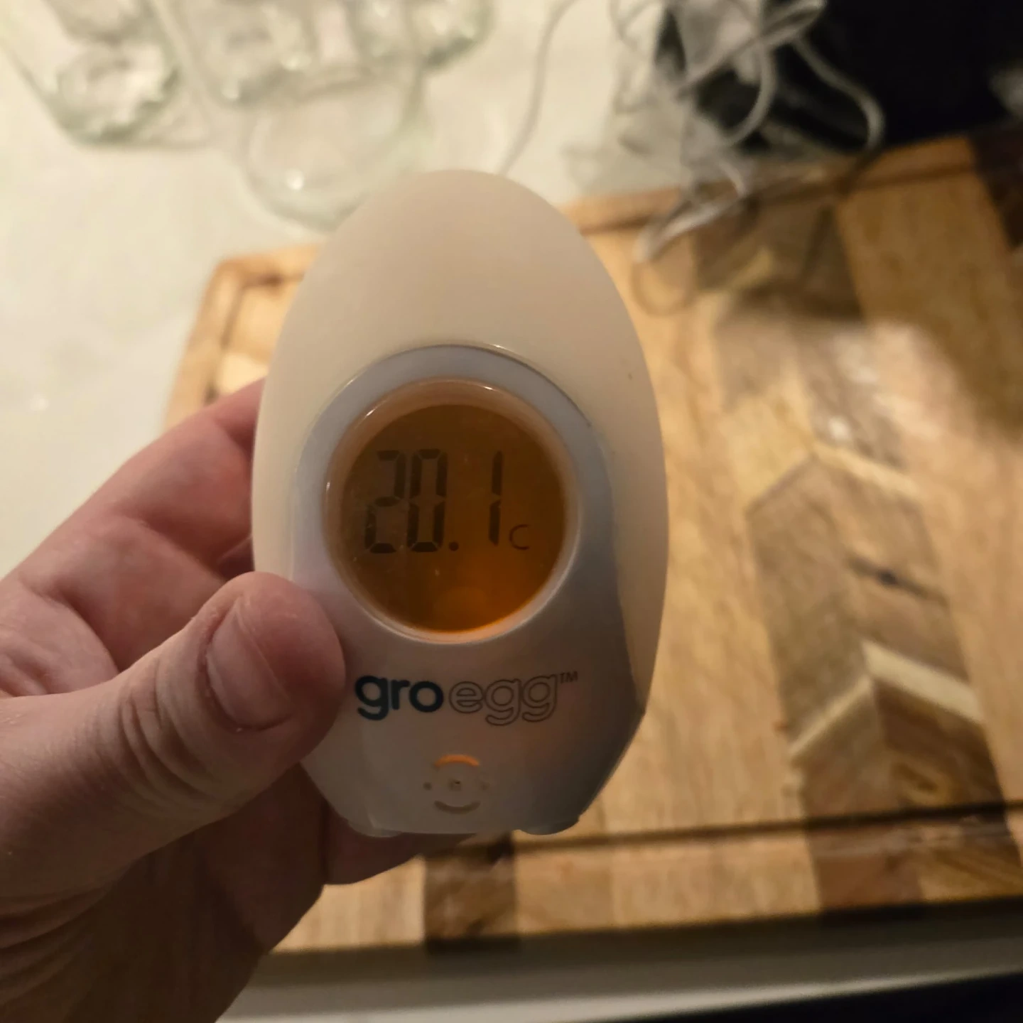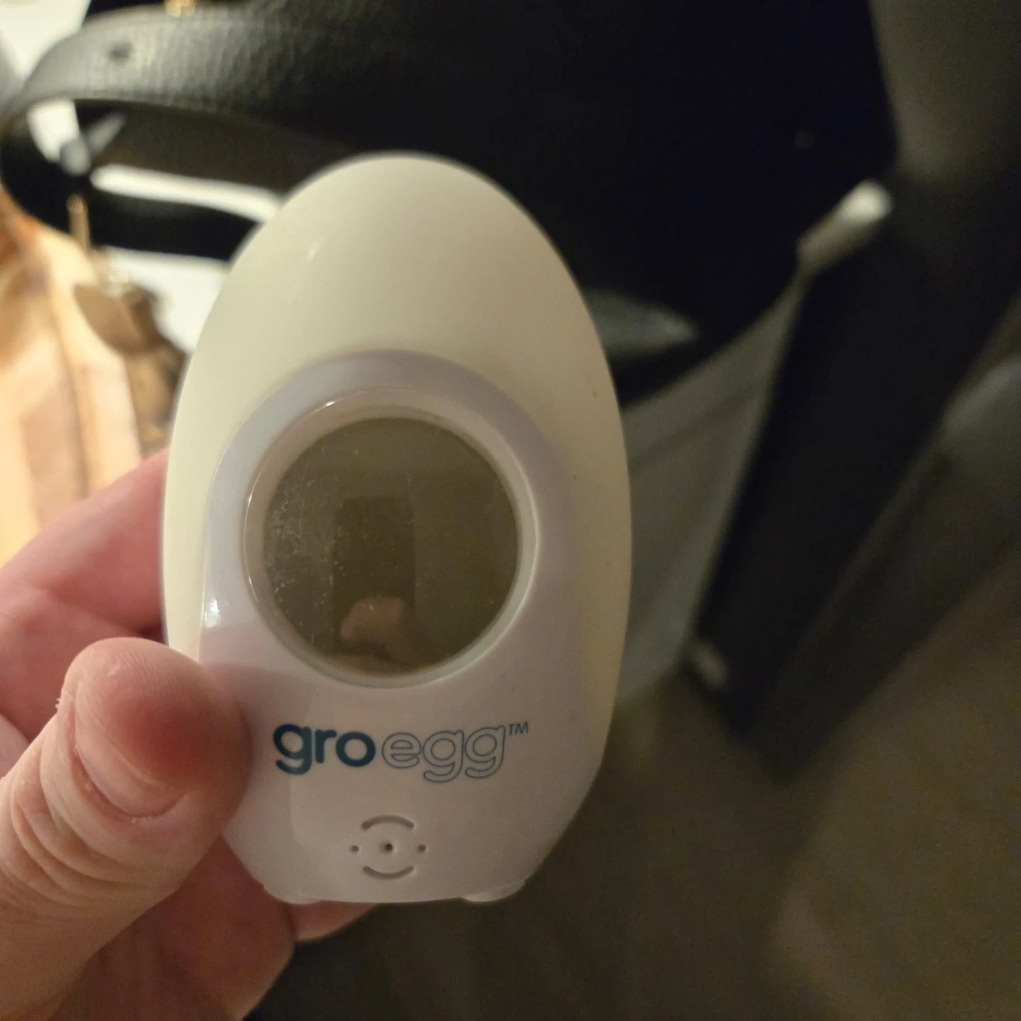 This is a Groegg digital room thermometer. It displays the room temperature clearly on its LED screen. It's helpful for keeping baby's nursery at a comfortable temperature!