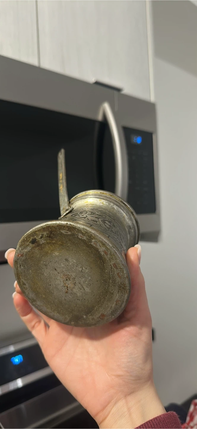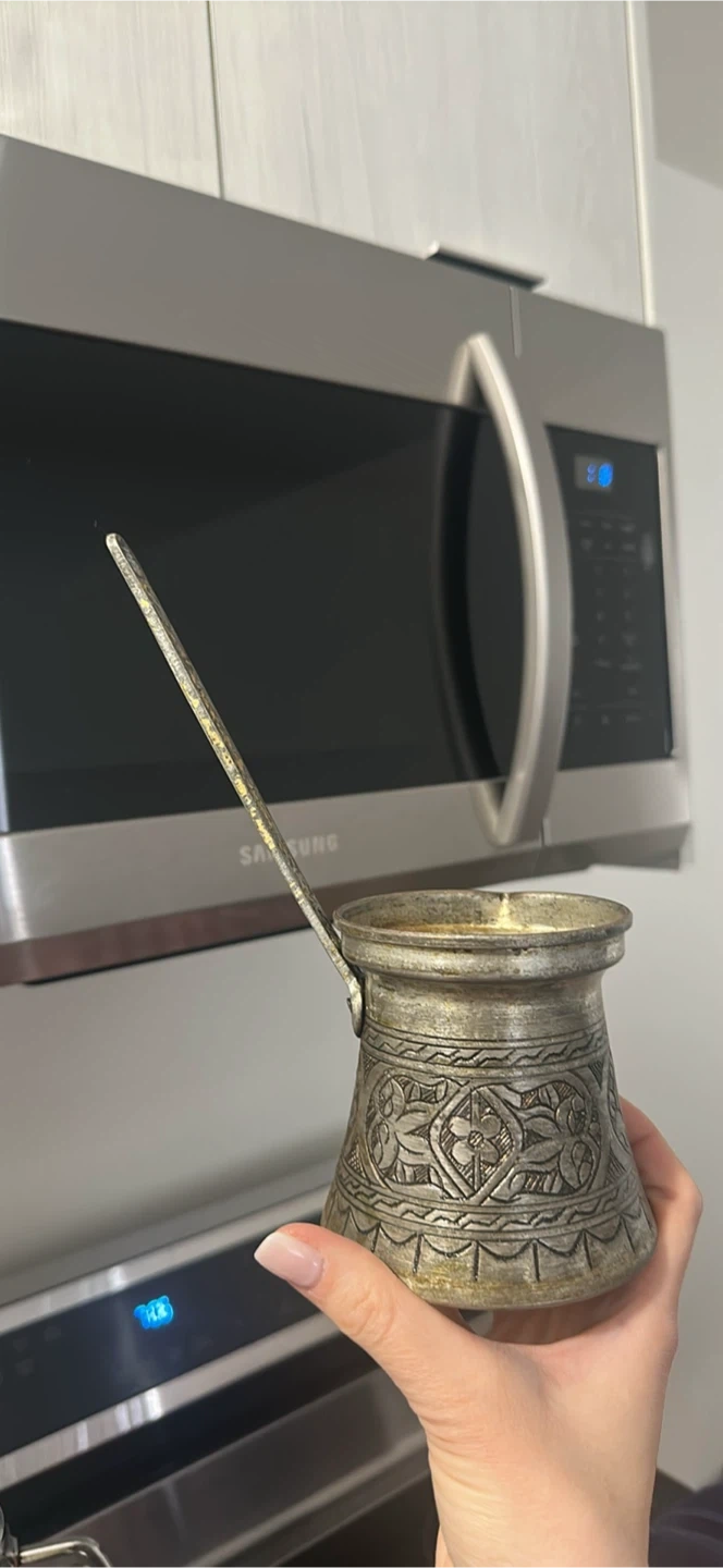 This is a vintage Turkish coffee pot, also known as a cezve or ibrik. It's made of metal with an intricate engraved pattern. Perfect for brewing traditional Turkish coffee or as a decorative piece!