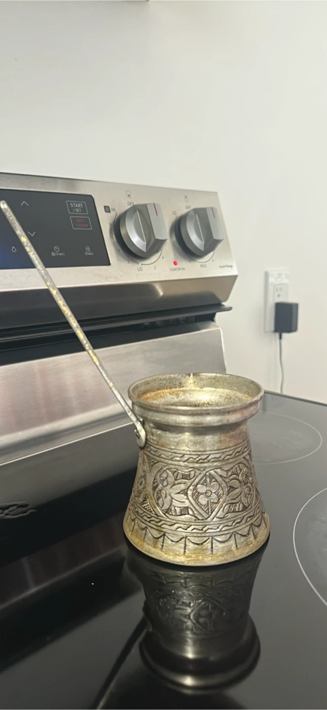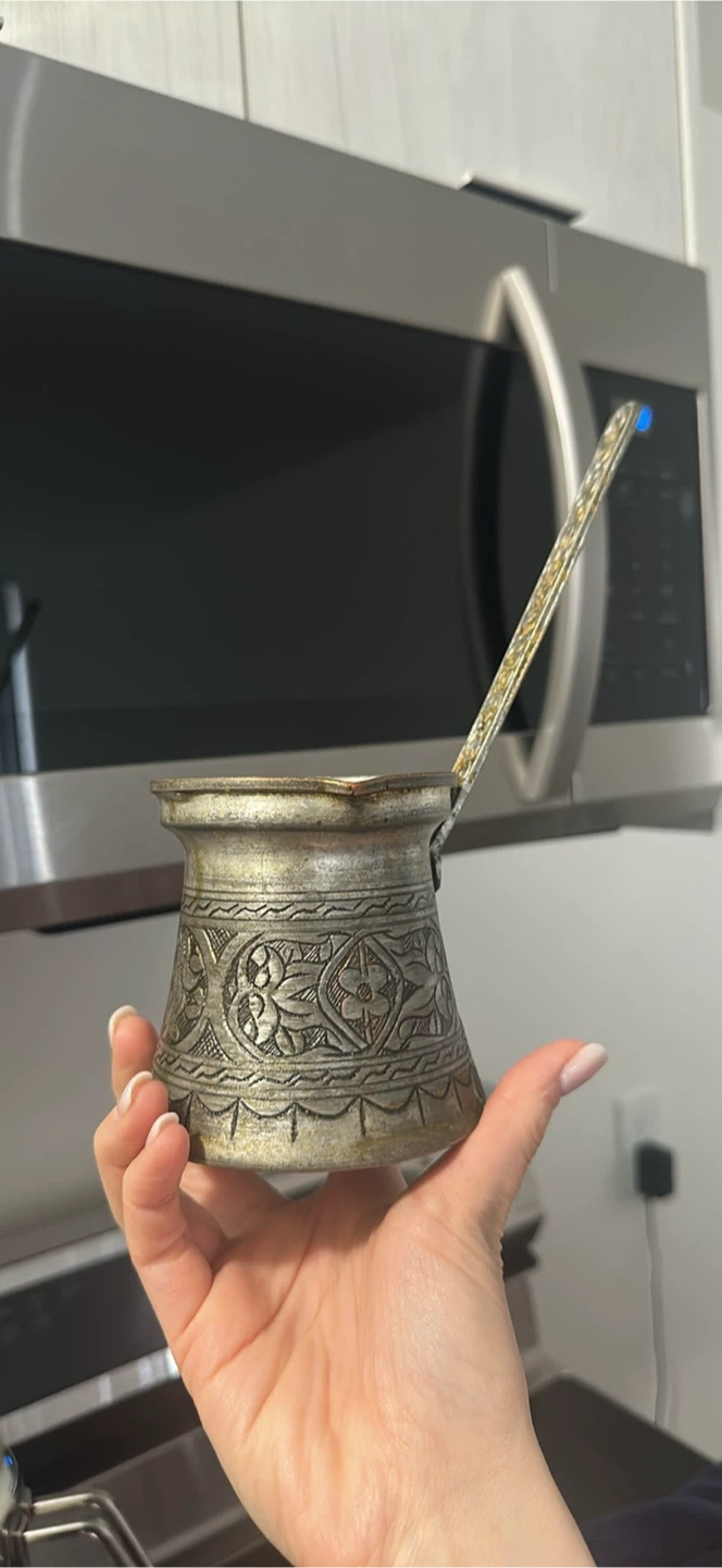 This is a vintage Turkish coffee pot, also known as a cezve or ibrik. It's made of metal with an intricate engraved pattern. Perfect for brewing traditional Turkish coffee or as a decorative piece!