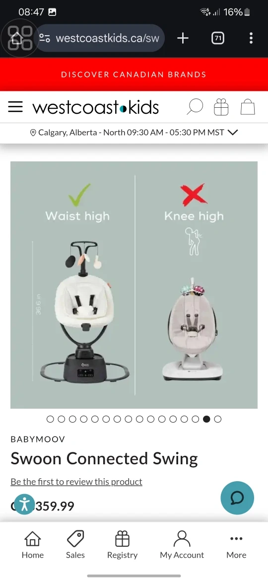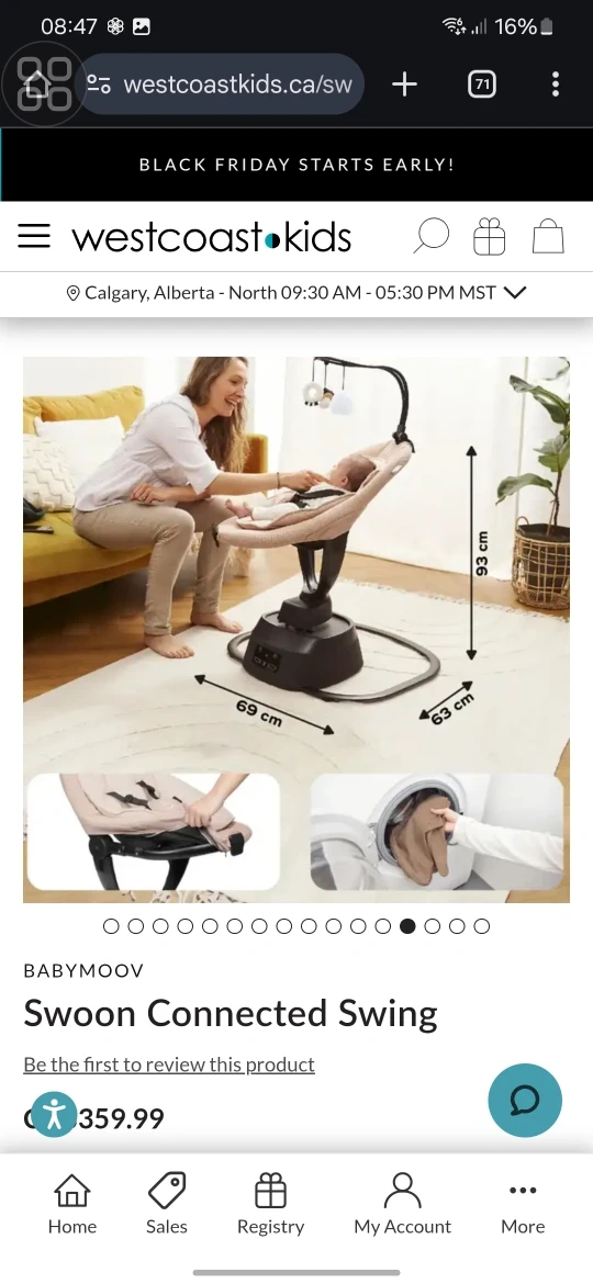 Selling a Babymoov Swoon Connected Swing! It has gentle rocking movements and 5 smooth speeds to mimic being rocked to sleep in the arms of a parent.