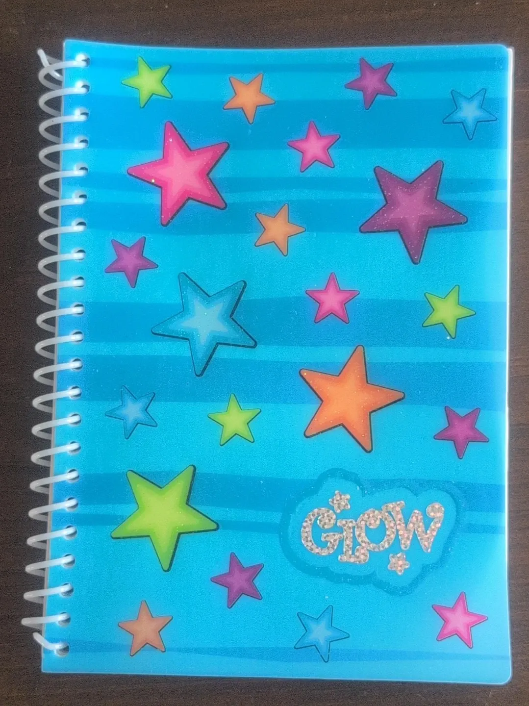 This is a fun blue spiral notebook with colourful glittery stars. It's perfect for jotting down notes or for creative writing! Lined pages inside.